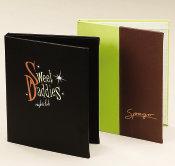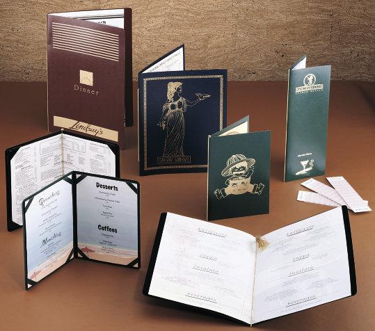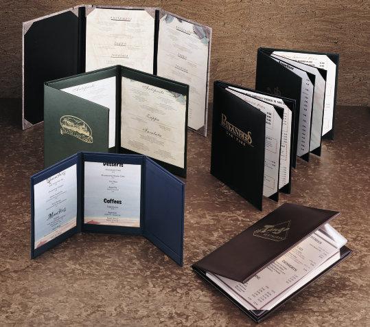 ■ The ever popular economical CAFE MENU COVERS allow quick changes of menu pages. With the crystal clear plastic covers, your menu cover page can be copied in multiple colors to portray the image of your restaurant. CAFE MENU COVERS are manufactured with 13 mil box grade plastic, single sewn folded cloth back buckram, taped edges and spine. Brass corners finish the cover. Folded menus have pockets opening on the inside spine edge; single panel covers open at the top: all are stock items except the three and four panel book style items. Custom sizing available, call sales office for pricing.