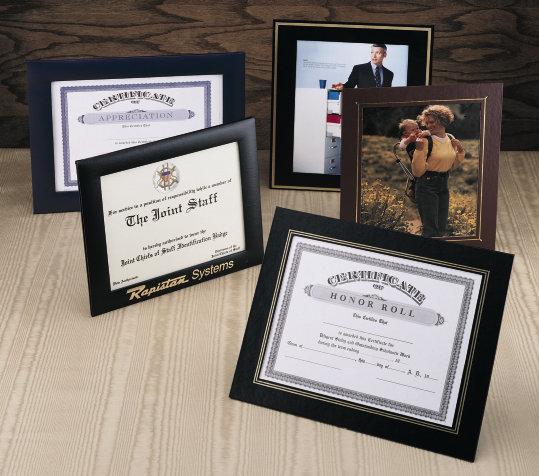 To present your certificate or photo for all to see and admire. The padded frame construction has a turned edge opening with a clear plastic protector. The frame back is die cut to stand or hang either vertical or horizontal position (see page 17). Foil imprinting is available – see border size when planning imprint layout on all frames.