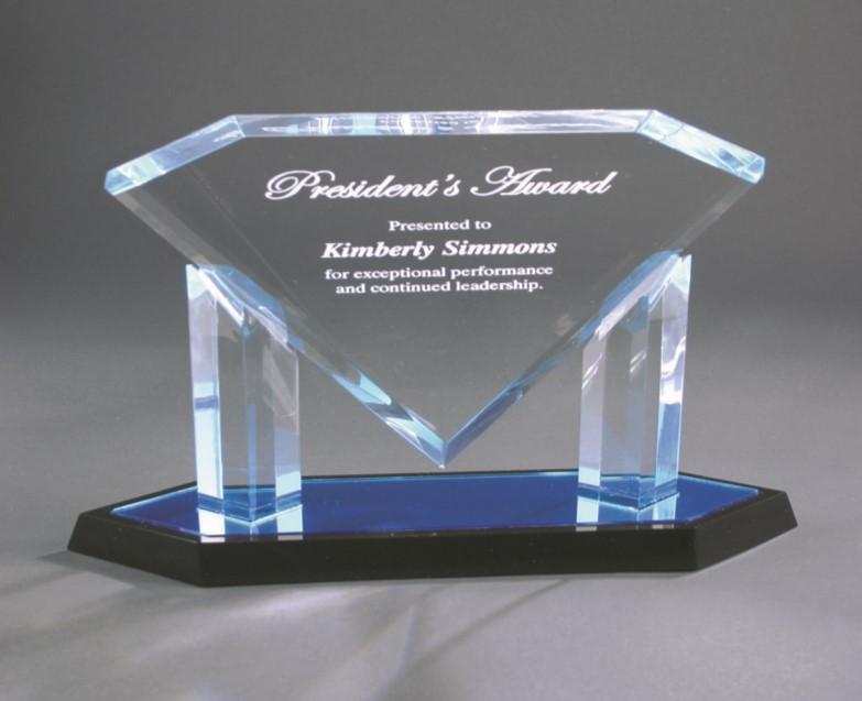 Self-standing acrylic awards, no bases needed. 1-1/4” thick with flat surface. Price includes laser engraving.