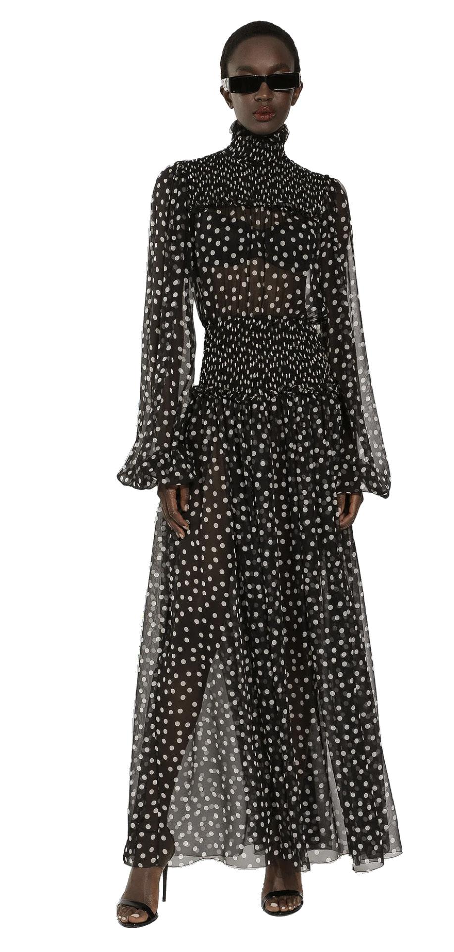 One of our favourite looks was from the latest Dolce & Gabbana Women’s SS/25 Collection. A Chiffon midi dress with smock stitching and micro-polka dot print at £3,800. Floaty and dreamy – perfect for race day events.