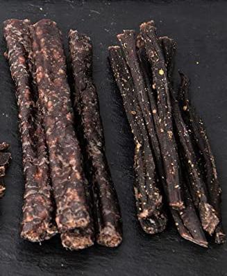 Our Protein Sticks, either Chilli or Plain, have less moisture than biltong and are more spicy! These biltong sticks come in various sizes, and are usually slender thin, with little-to-no fat and are one of our more popular products. Tip: Plain variety is also great for teething babies!