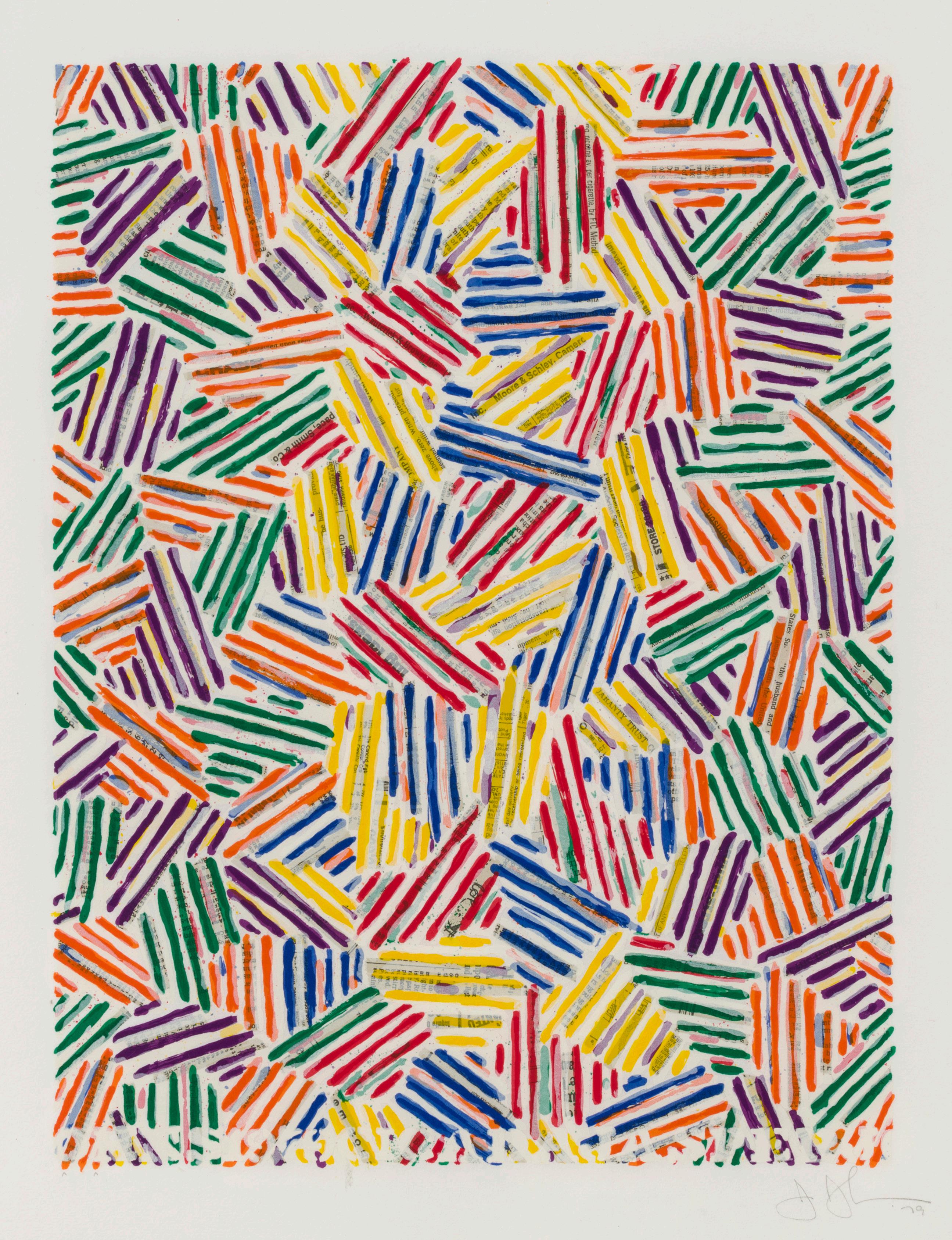 Beginning in the 1970s, Jasper Johns (b. 1937) began experimenting with the crosshatching motif. The original pattern was based mostly upon a deconstruction of an Edvard Munch self-portrait, Between the Clock and the Bed. The bedspread in Munch’s 1943 painting contained a crosshatch ing pattern Johns would reference throughout the 1970s and early 1980s in his paintings, drawings, and prints. Seemingly chaotic and created at random, Johns’ crosshatchings are in fact governed by print-based pat terns of reversal, repetition, and rotation arranged according to complex systems.