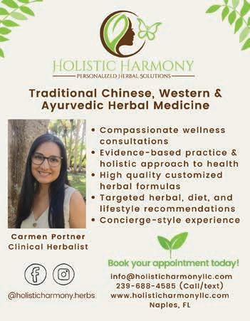9 September 2023 Got Chronic Disease? Get A Functional Medicine M.D. Evaluation! There are hidden causes to your disease. Dr. Torres will help you find them and get rid of them. This will allow your body to finally heal! (239)444-5636 27499 Riverview Center Blvd., Suite 255 Bonita Springs, FL 34134 Visit www.upstreammd.com for more information. Zorayda “JiJi” Torres, Md, aBiHM Diplomate, American Board of Internal Medicine Diplomate, American Board of Integrative and Holistic Medicine Certified Practitioner, Institute For Functional Medicine Zorayda “Jiji” Torres has 17 years of experience and knows the limitations of conventional internal medicine. Adding functional medicine to your treatment will surely enhance the healing process. Southwest FL Holistic, Metaphysical & Crystal Expo 85 Vendors, readers, practitioners, artists, authors, & much more! September 16 & 17 Charlotte Harbor Event Center • 75 Taylor St. • Punta Gorda Speakers all day, each day, included with daily admission FOOD AVAILABLE ON SITE • FREE PARKING ONLY $12 ADMISSION For discounted admission and more details visit: SpiritFestUSA.com SEVA Stress Release Acupressure Class Sunday September 10, 2023 The World Tennis Club 4802 Airport-Pulling rd, naples part 1: Seva Stress release for Self Care (3 hours) part 2: Seva Stress release for Others (3 hours) Lunch included! Self-Care (part 1 Only) $60 Self-Care and Others (parts 1 & 2) $120 alvina QuatranO 732-266-5276 AlvinaQ@AohMassage.com www.Soullightening.org RB Institute, Inc. Text for appointment 239-939-4646 or book your appointment online! www.RobynBerry.com Cash, check, Square, all CreditCards and Health Savings Cards We require a 24 Hr Notice by text to reschedule or to cancel your reservation or appointment or the full amount for the reservation or appointment scheduled will be charged. www.RobynBerry.com • 12651 McGregor Blvd., Ste. 5-502, Fort Myers, FL 33919 • 239-939-4646 • Open Mon-Fri 8 to 5 MM7376 · MA018351 · CRR1148 C. Robyn Filkill-Berry Florida Licensed Colonic and Massage Therapist LMT CRR CCT CLDT, COT, CMSA, ND, CTM Therapeutic Massage • Pure Fiji Swedish • Myofascial Neuromuscular • Craniosacral • Aqua Craniosacral • Lymph Drainage Traditional Thai Massage Jivaka Lineage • Pure Fiji Total Body Indulgence Ear Candles • Reflexology • Raindrop Therapy • Heart Centered Therapy 5D Body Constellation Therapy • Halo Blue Violet Lazer Botannicals Asyra/Qest Meridian Stress Analysis • Parafin Hands/Feet MPS • In-fared Sauna • Ionic Detox Foot Bath Hyperbaric Chamber HBOT • BEMER • PER 2000 PEMF Ozone/Oxygen Steam Cabinet Power Plate Air Adaptive Pro 5 COLONICS Gravity Enclosed UV/Oxygen/Ozone Medical Grade Filtered Water Colonic Hydrotherapy