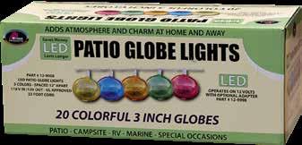 LED Patio Globe Lights feature 20 LED lights in 3-inch diameter globes. The colorful globes are space 12 inches apart. The 22-foot-long cord is a UL-approved power supply. LED lights use less power than traditional bulbs, saving money by lasting longer. An optional 12-volt adapter is available. LED Patio Globe Lights’ SKU number is 12-9008. primeproducts .com