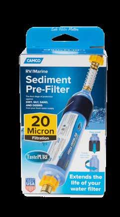 Camco’s TastePure RV Sediment Pre-Filter provides protection against dirt, silt, sand and debris in an RV’s fresh water supply. The compact pre-filter blocks particulates that can clog inline RV water filters. The pre-filter removes particles greater than 20 microns. The pre-filter fits Camco and other standard inline water filters.