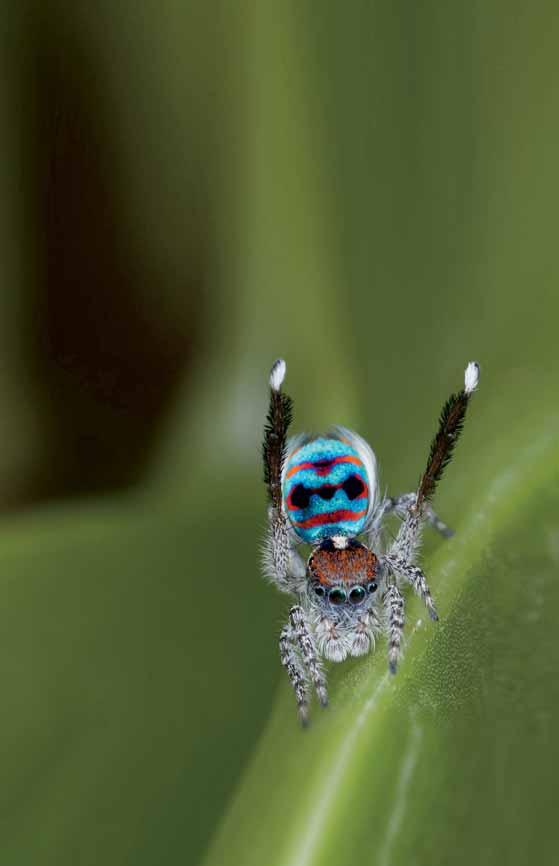 EYES The spider’s eyes can perceive the full spectrum of color, including ultraviolet light useful for hunting and observing mates’ showy displays.
