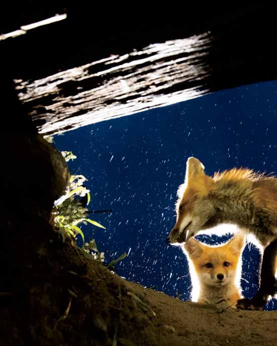 At nearly 2 am on a rainy summer evening in 2020, I made my way to downtown Whitehorse, the capital of Canada’s Yukon territory, and placed my camera in a fox family’s den. I set up some lights and waited for the right shot, praying that the foxes’ curiosity wouldn’t spur them to steal my equipment. Eventually these two kits started playing by the entrance of their shelter, and I clicked my remote shutter.