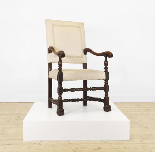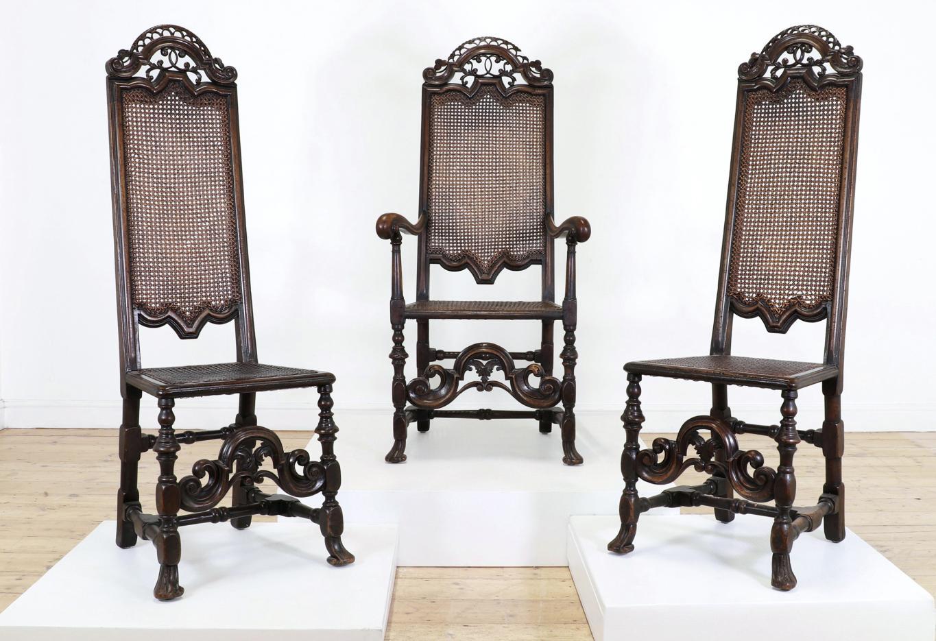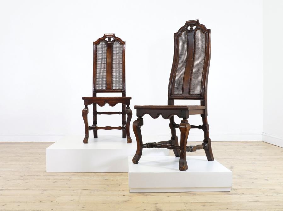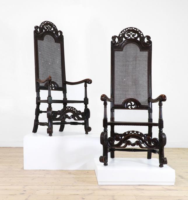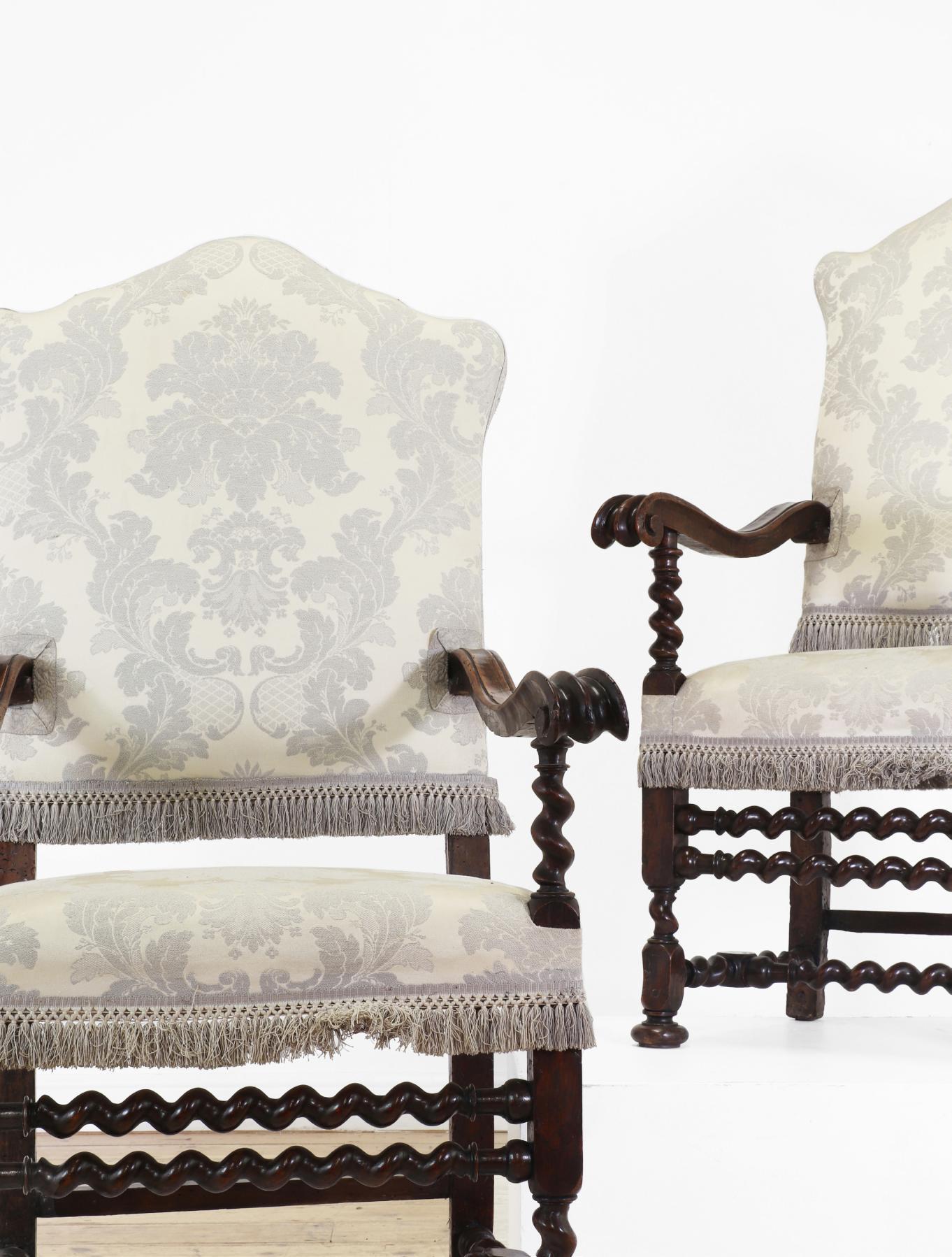 A pair of large walnut open armchairs, late 17th century, Italian, each with an arched back and scrolling arms, raised on turned supports united by double stretchers, 77cm wide