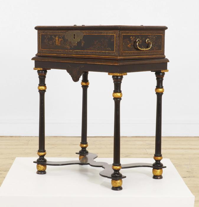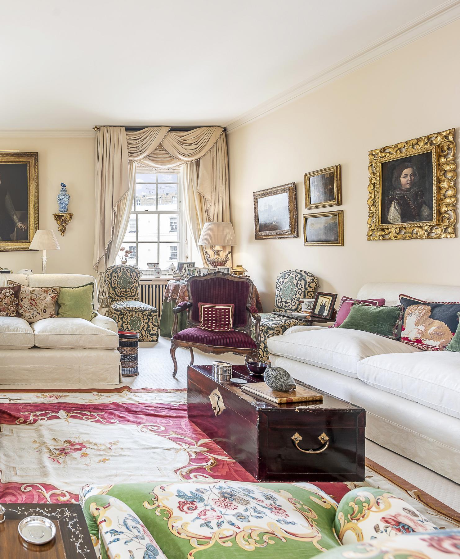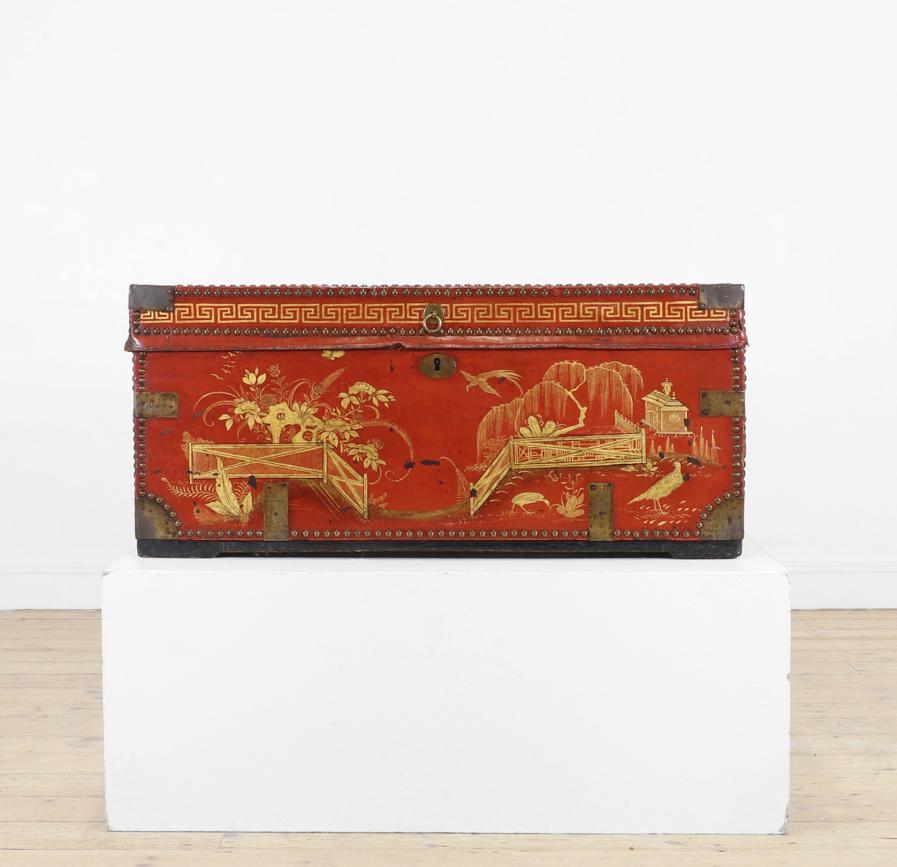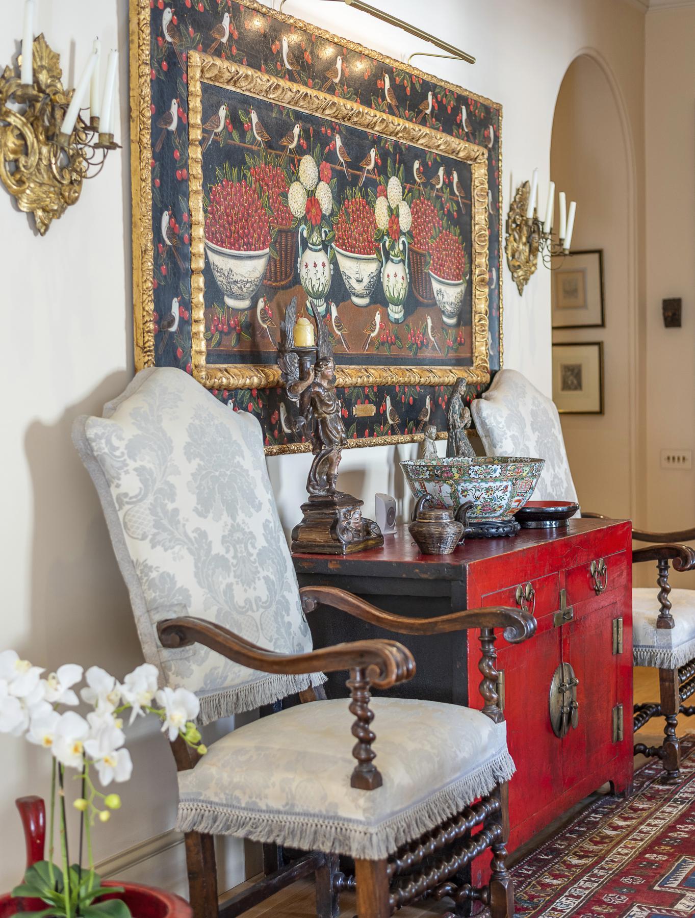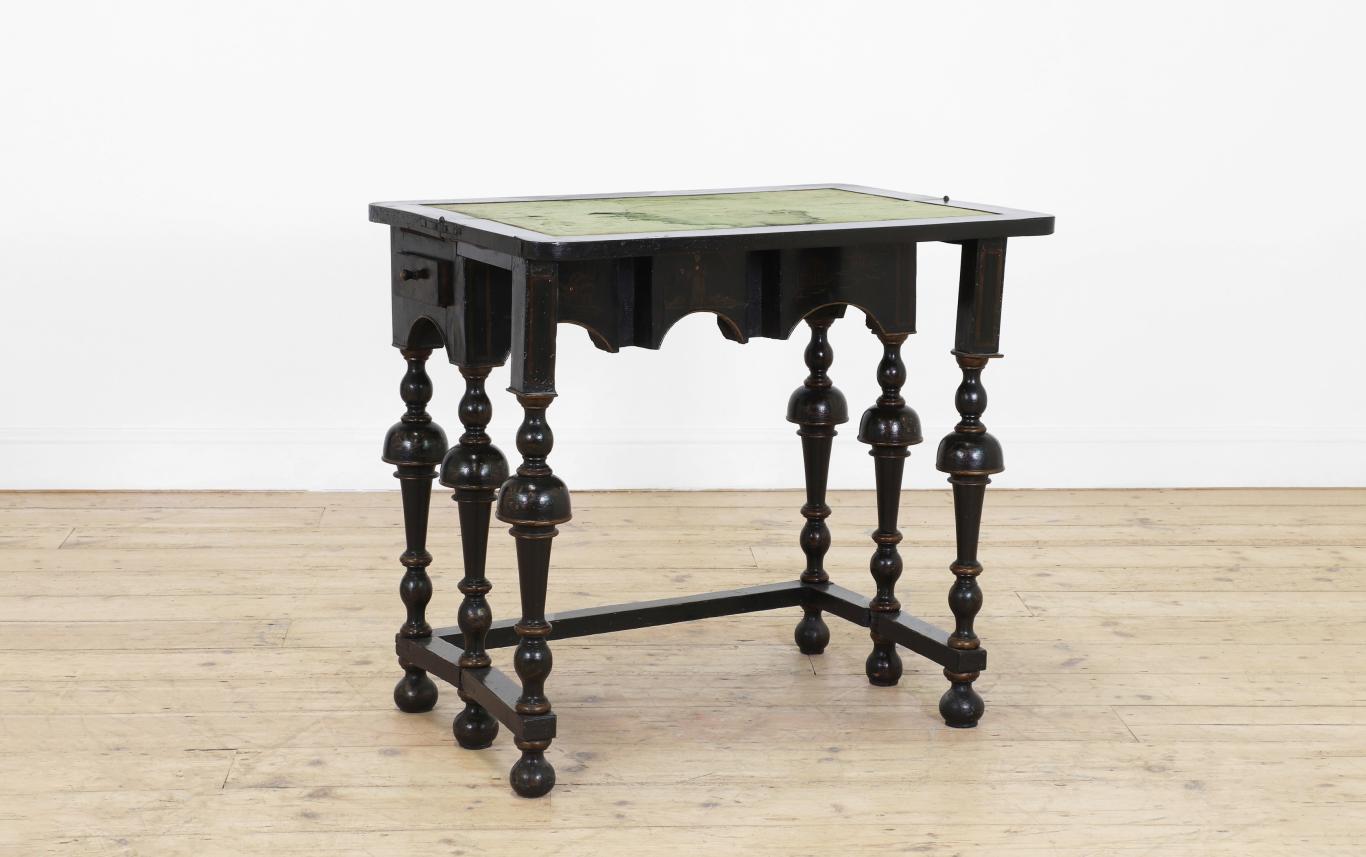 The carefully chosen furnishings in this sale radiate an appreciation of colour, pattern and texture, exemplified by Chinese lacquer and floral upholstery, punctuated by works of fine painting and furniture, such as a commanding portrait of a gentleman from the circle of Giovanni Battista Moroni and a French ‘Croix de Lorraine’ table formerly in the collections of the Metropolitan Museum, New York, and the American financier John Pierpont Morgan (1837-1913).