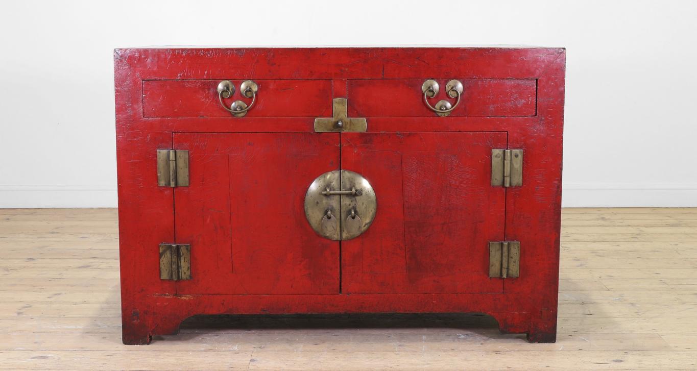 A red-lacquered elm side cabinet, Qing dynasty (1644-1911), Chinese, the rectangular top above drawers and doors, with metal mounts, raised on bracket feet, 127cm wide