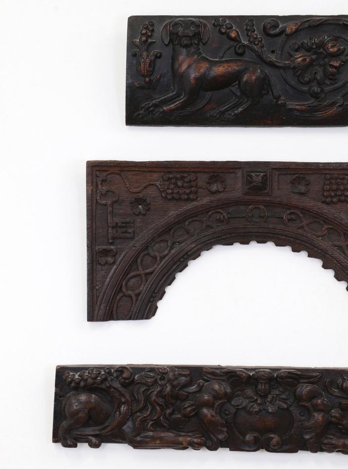 A group of carved and pierced oak wall appliqués, c.1860 and later, in the manner of Grinling Gibbons, modelled with acanthus leaves, flowers and fruit, central section 96cm long festoon pair each
