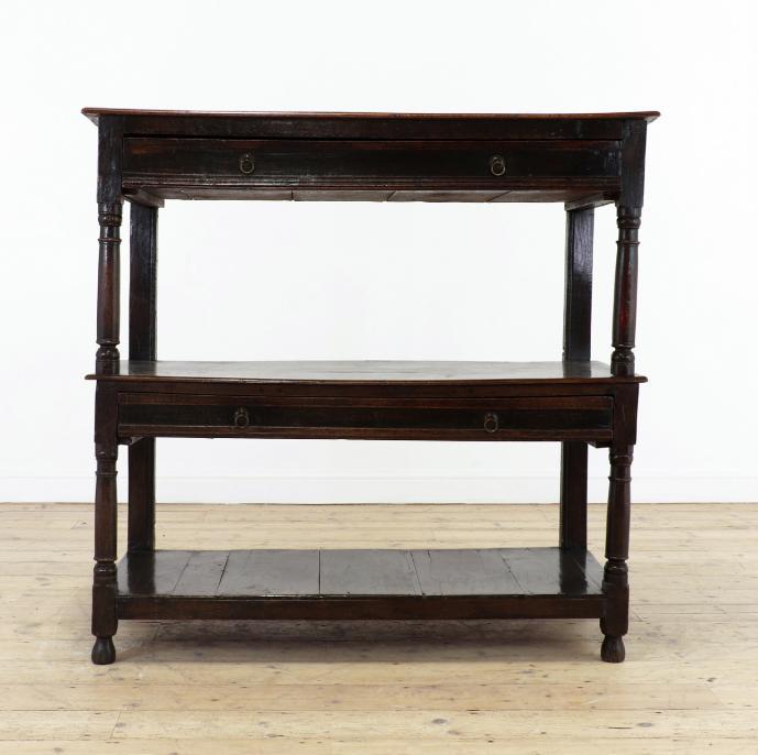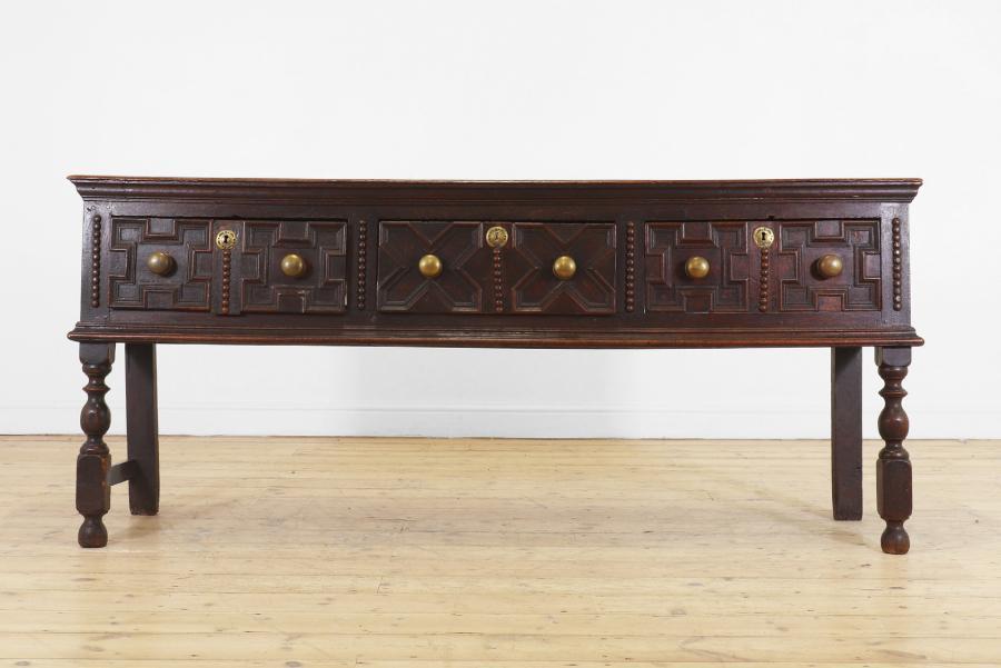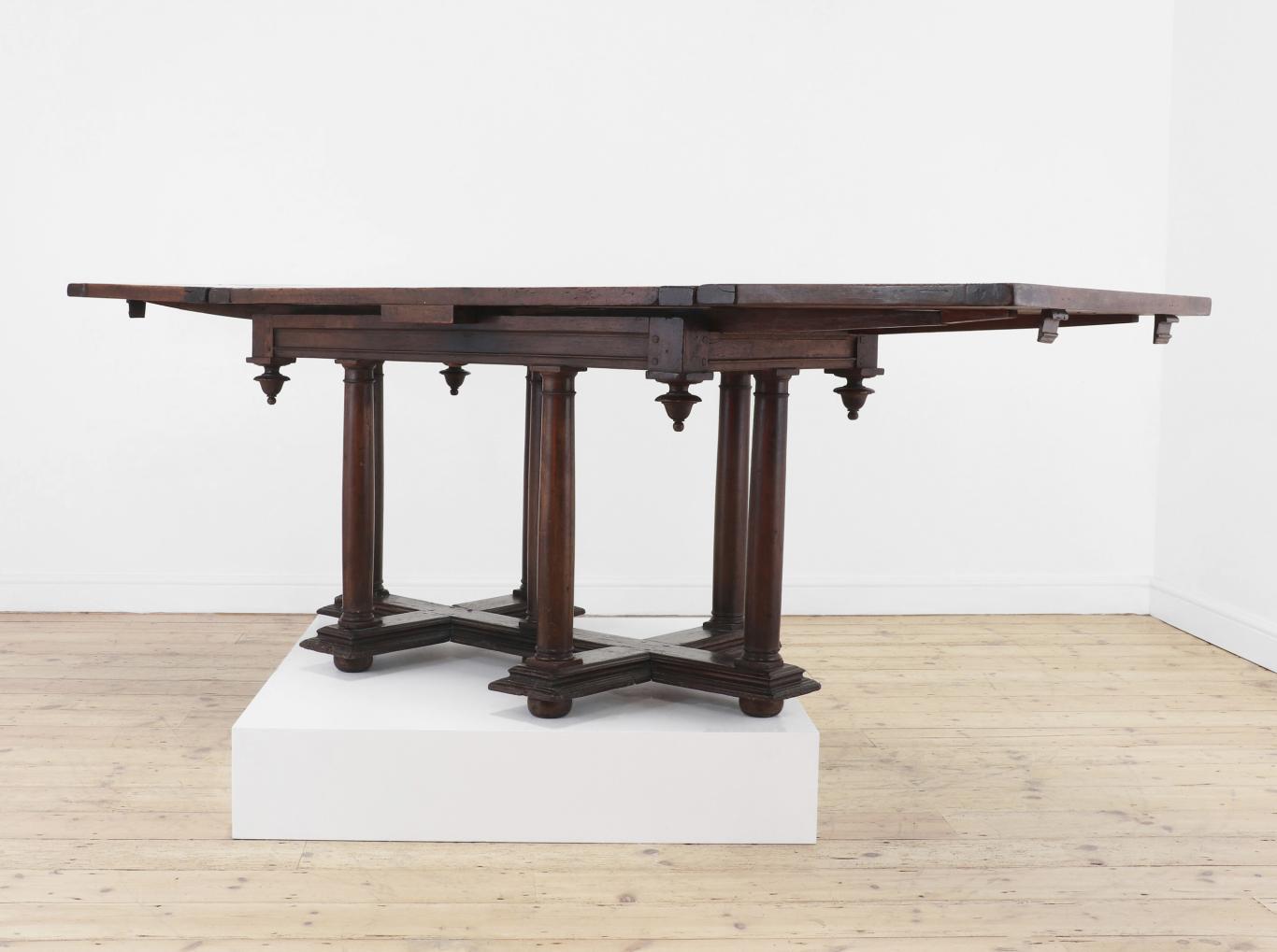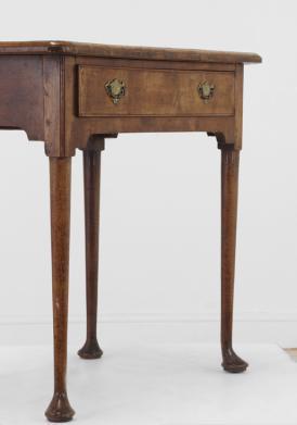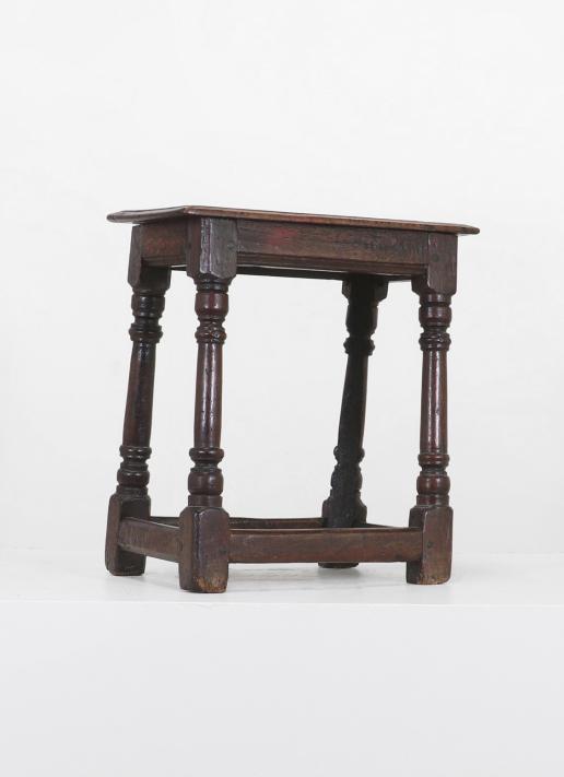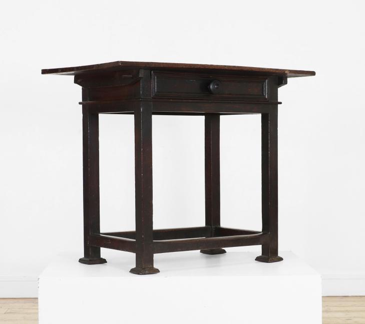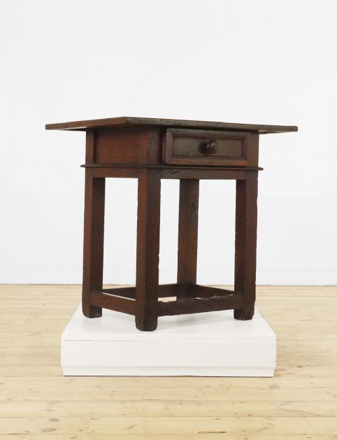 A walnut side table, 17th century, Italian, the rectangular top above a single moulded drawer, raised on square supports united by stretchers,