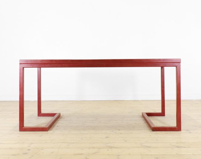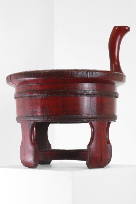 A red-lacquered baby bath, Qing dynasty (1644-1911), Chinese, on four cross-stretchered supports, with a handle to one side, 43cm wide