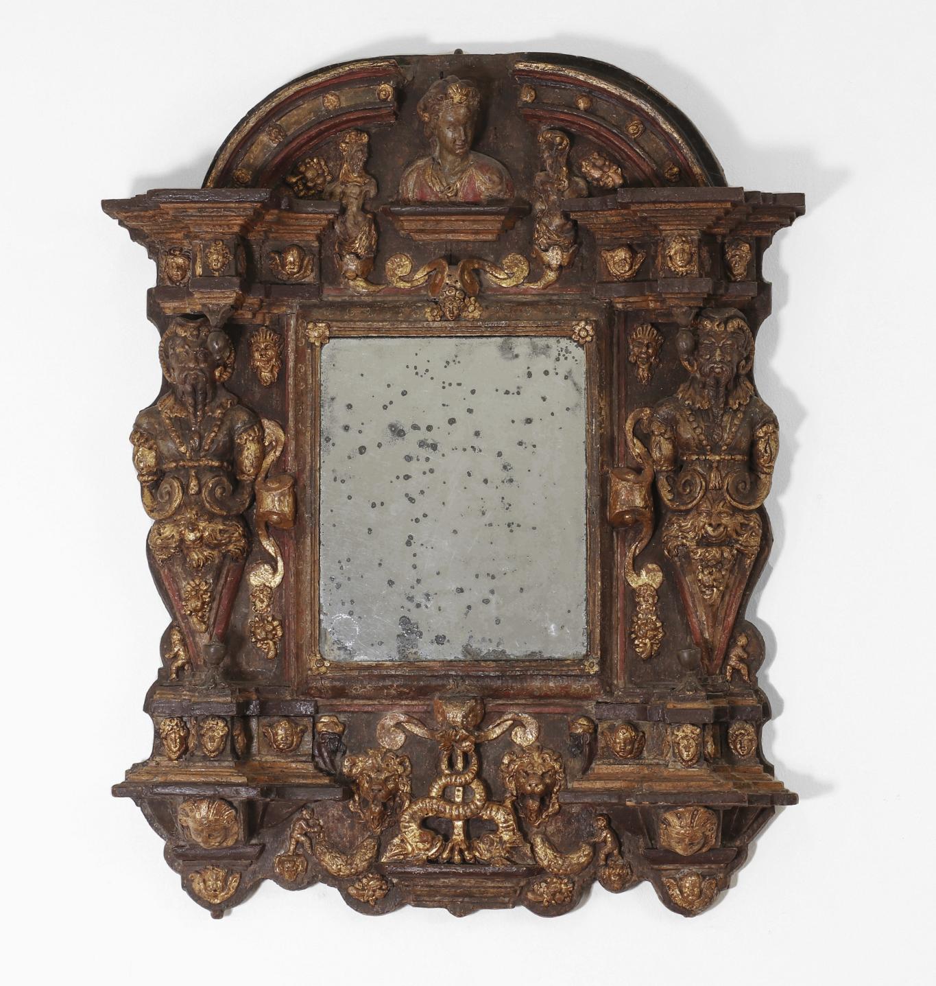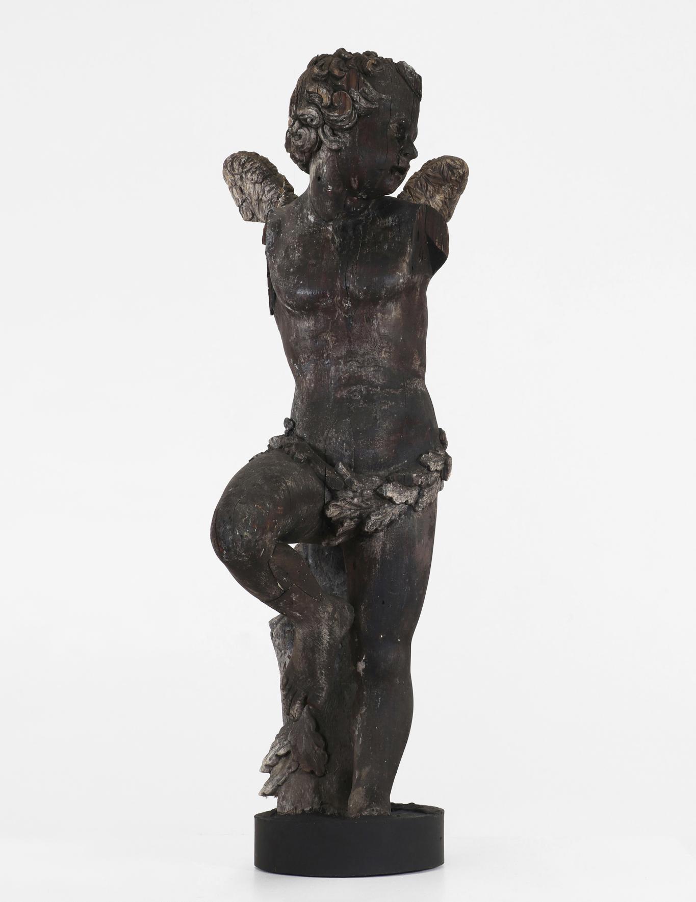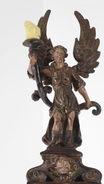 A carved and polychrome painted candleholder, 17th century, North Italian, in the form of an angel on a scrolling base, 25cm wide