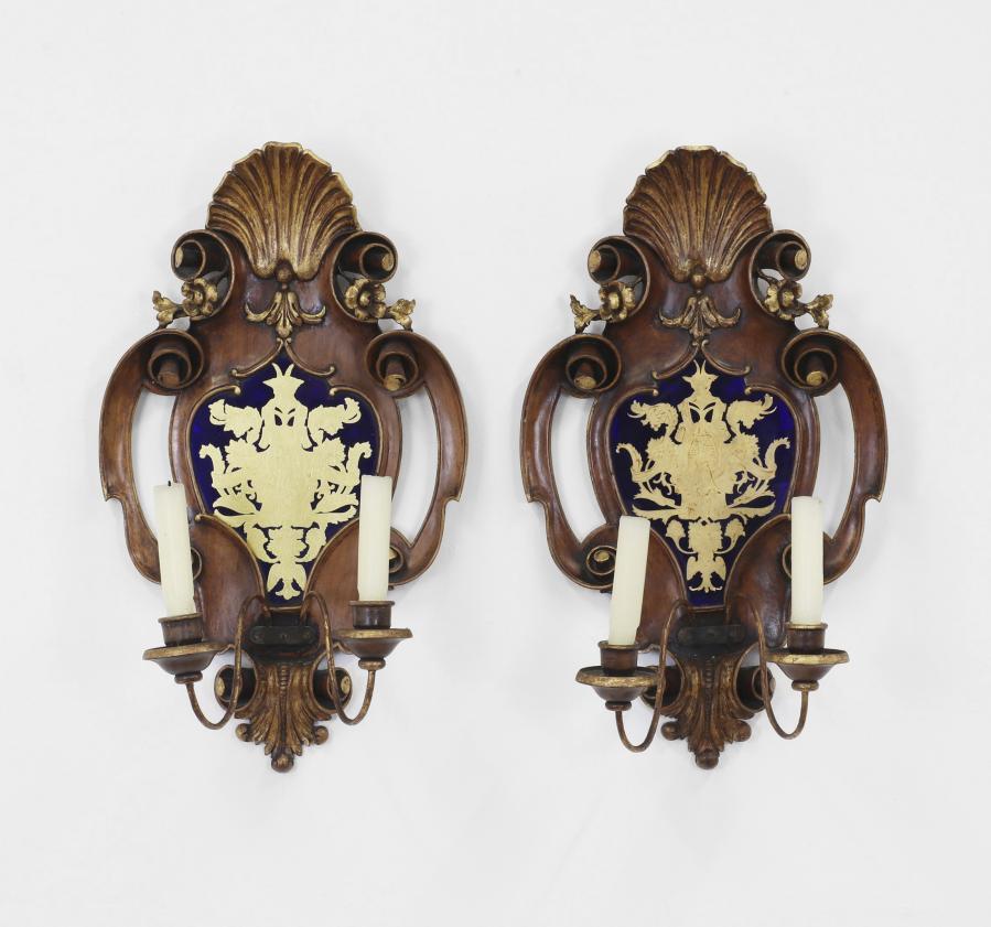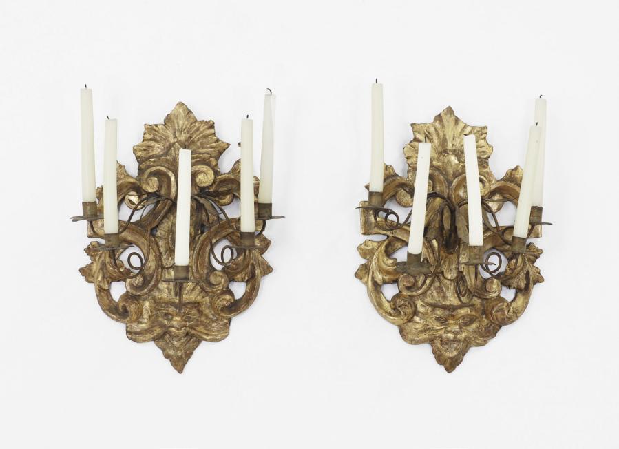 A pair of giltwood wall lights, 19th century, Italian, each with carved foliate and mask detail, supporting four metal branches, 34cm wide