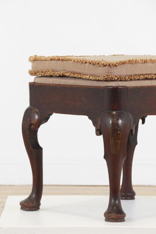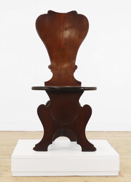A George II mahogany sgabello hall chair, c.1740, with a shaped back and dished seat, raised on splayed supports, 46cm wide