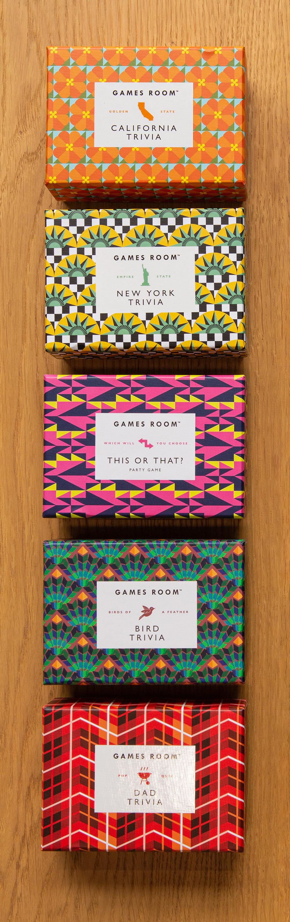 Discover Games Room, a premium collection of classic games, spirited trivia, and thoughtful gift sets. The classic and stylish Games Room line is all about good design, from the vibrant, geometric-patterned keepsake boxes to the games themselves: each thoughtfully designed product looks as beautiful on the shelf as it is fun to play.