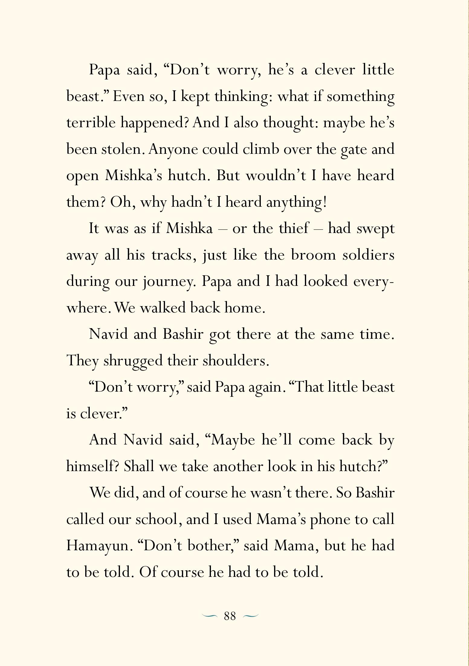 Roya, her three brothers, and their parents have a new family member— Mishka, a bunny rabbit. He soon becomes a beloved part of their new home and gradually, the rabbit—and also Roya—get to hear the story of the family's journey from Afghanistan to the Netherlands. Told from different perspectives every time: big Bashir, gentle Hamayun, tough Navid, and sometimes Mom and Dad. Mishka and Roya listen. Anoush Elman and Edward van de Vendel became friends upon Elman's arrival in the Netherlands, and fifteen years later, they decided to write a story for younger readers about his family's experience. This gorgeous chapter book—illustrated throughout in full color—is a tender, lyrical story of a young girl processing a new country, new school, and new friends—and a bunny escape!—in a story readers and parents will treasure.