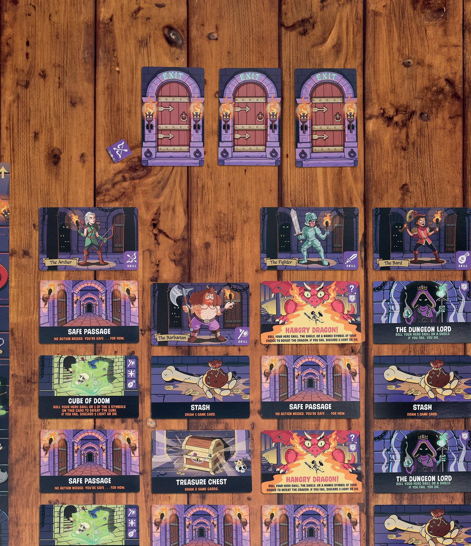 Race to reach safety while keeping your torch lit, wreaking havoc on your companions, and avoiding joining the Skull Legion. There are three exits, but only one grants freedom freely. Choose wisely. Includes 5 Hero cards, 78 Game cards, 34 Dungeon cards, 6 Skull Legion cards, 5 Reference cards, 3 Exit cards, Path Guide, wooden die, and instructions. Printed using FSC paper and soy inks.