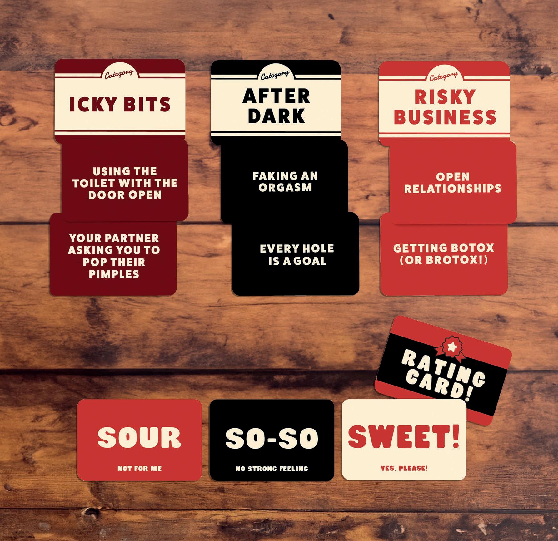 From quickies, pole dancing, and PDA, to kinks, preferences, and positions, this fast-paced adult party game is often frantic, sometimes shocking, and always fun. So, c'mon, let's get closer. Includes 186 Topic cards, 24 Rating cards, and instructions. Printed using FSC paper and soy inks.