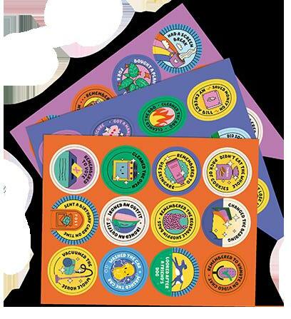 H ADASCREEN BREAK REMEMBERED T O F E ED THE PETS 3-5 20 THE TOOKSTAIRS PARTY GAME THE HILARIOUS NIGHT IN FOR FULLY GROAN-UP ADULTS BLOODDONATED ATE SALAD BACKED UP MYCOMPUTER SORTED INBOX OUT MY REMEMBEREDTO STAY HYDRATED AIM OF GAME First, pick a badge randomly and read it to yourself without showing the other players. Then, you must do
