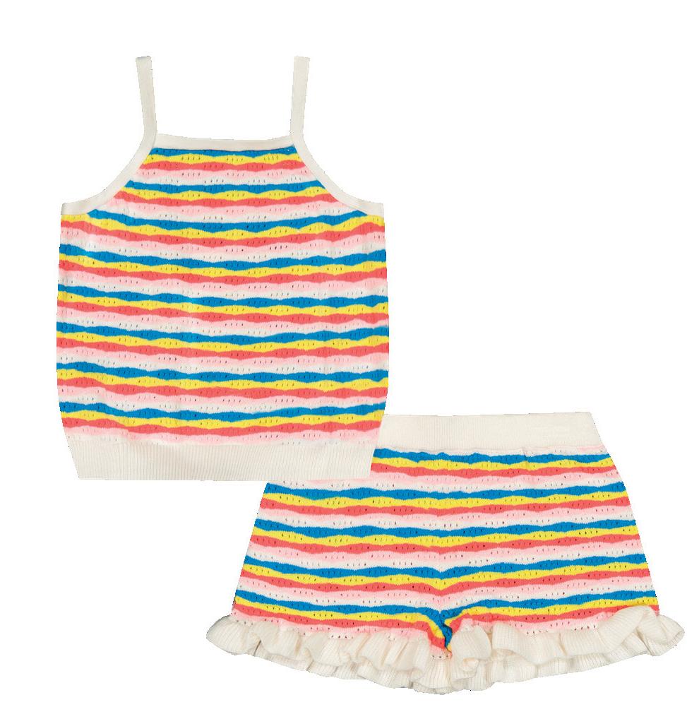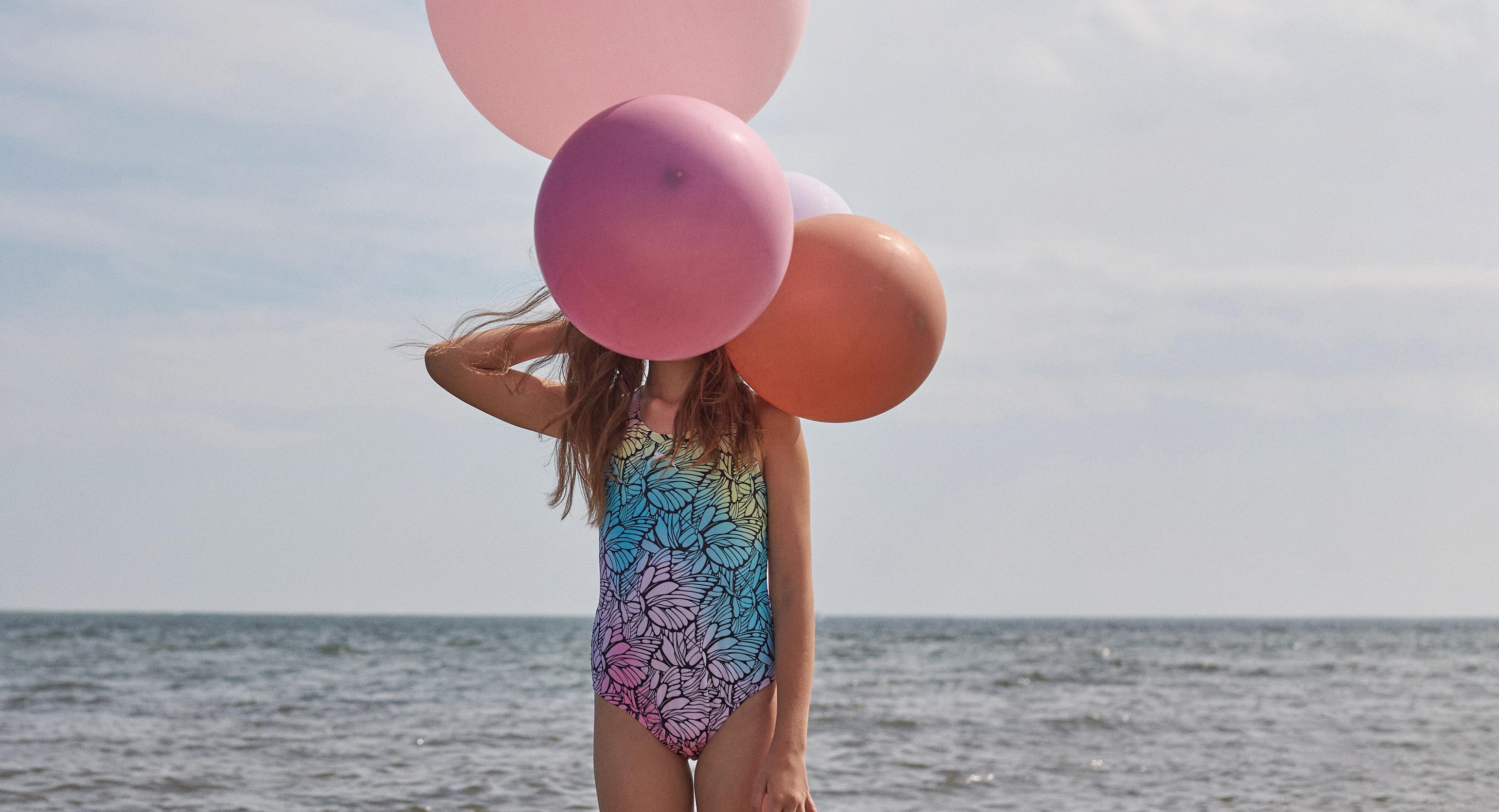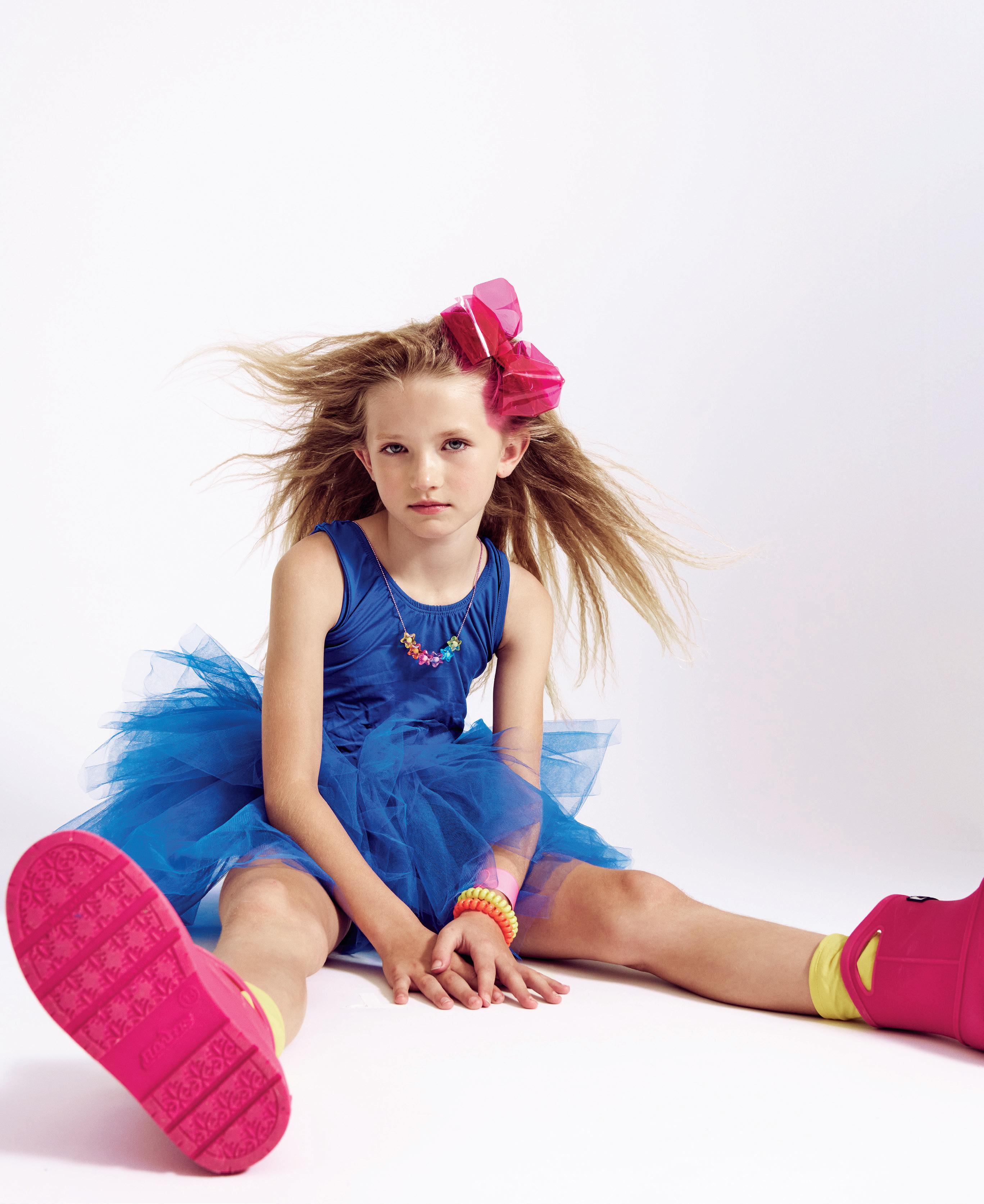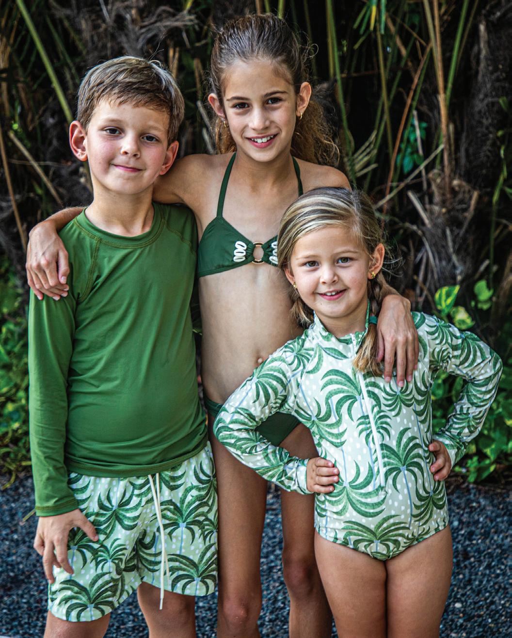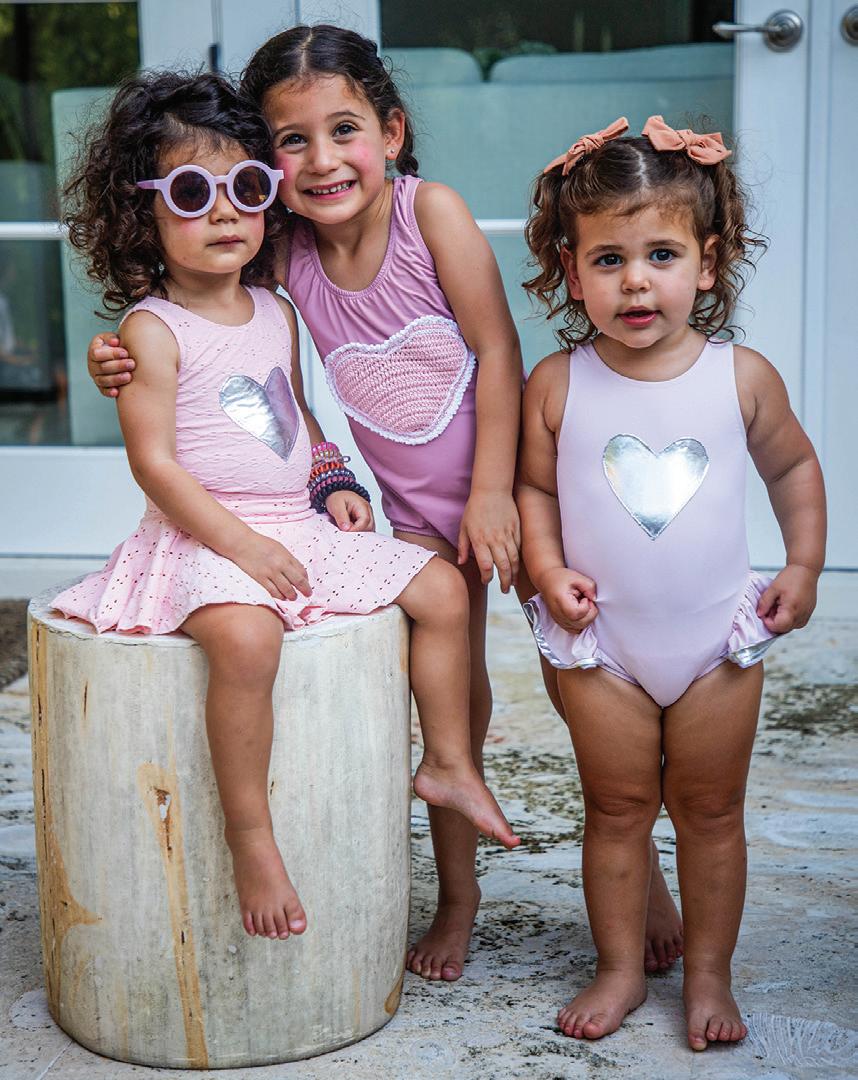 Violeta dances to the pool in a color-blocked Andy & Evan swimsuit and 100% Gumdrop necklace. Opposite: Aubriana rocks a tutu bathing suit by Mila & Rose, accessorized with a 100% Gumdrop necklace, Wee Ones hair bow, and Floafers boots with We Love Colors socks.