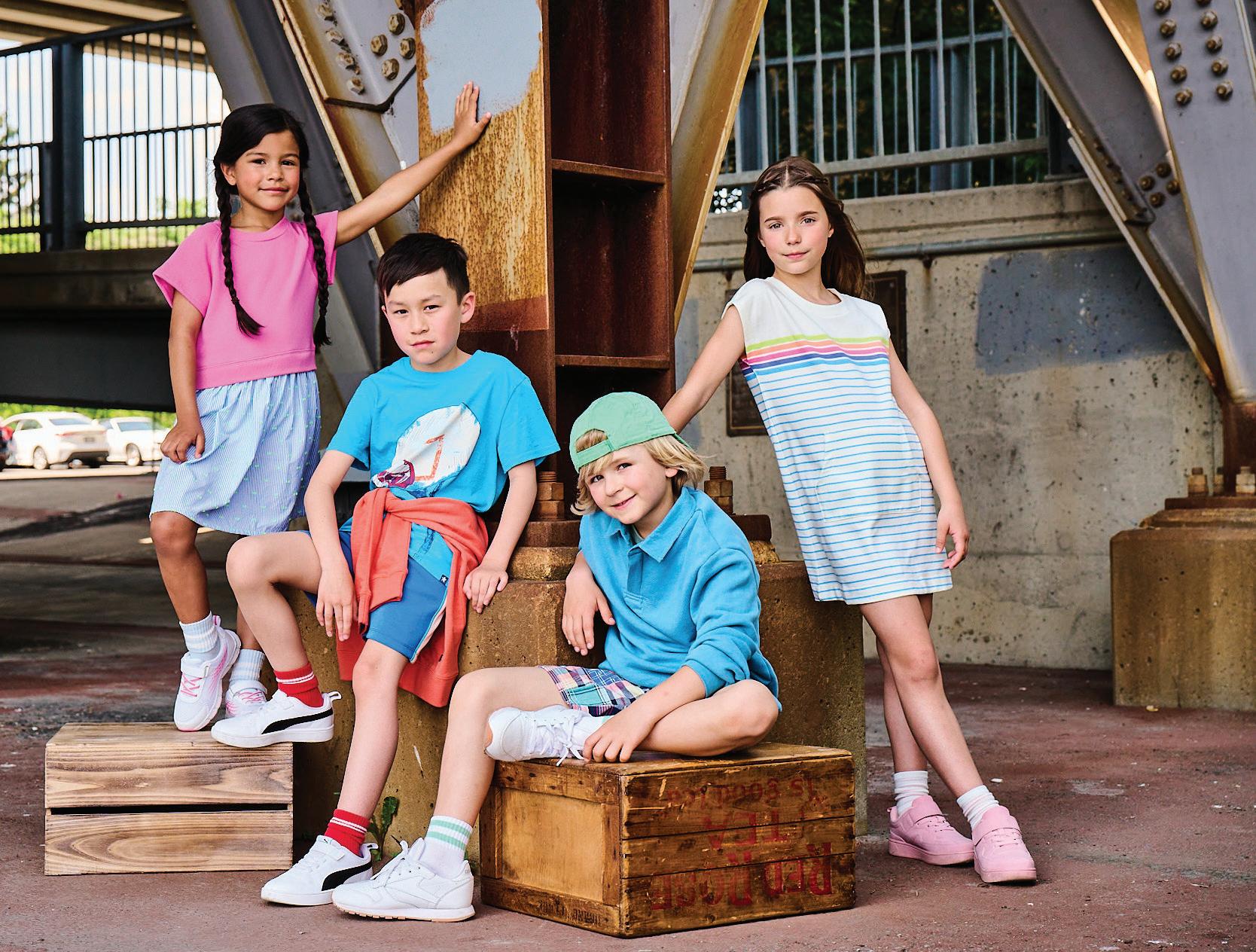 dresses you might see in Palm Beach at the beach on your mom, now little girls are wearing them all over the place. The biggest thing that is still growing with us is activewear — gym clothes, pleated tennis skirts, and that Lululemon/ Athleta look is constantly selling out in our stores. It’s what’s being picked up overseas and in Europe, too. For boys, there’s a soccer influence with Premier League–style outfits. It’s more sophisticated.