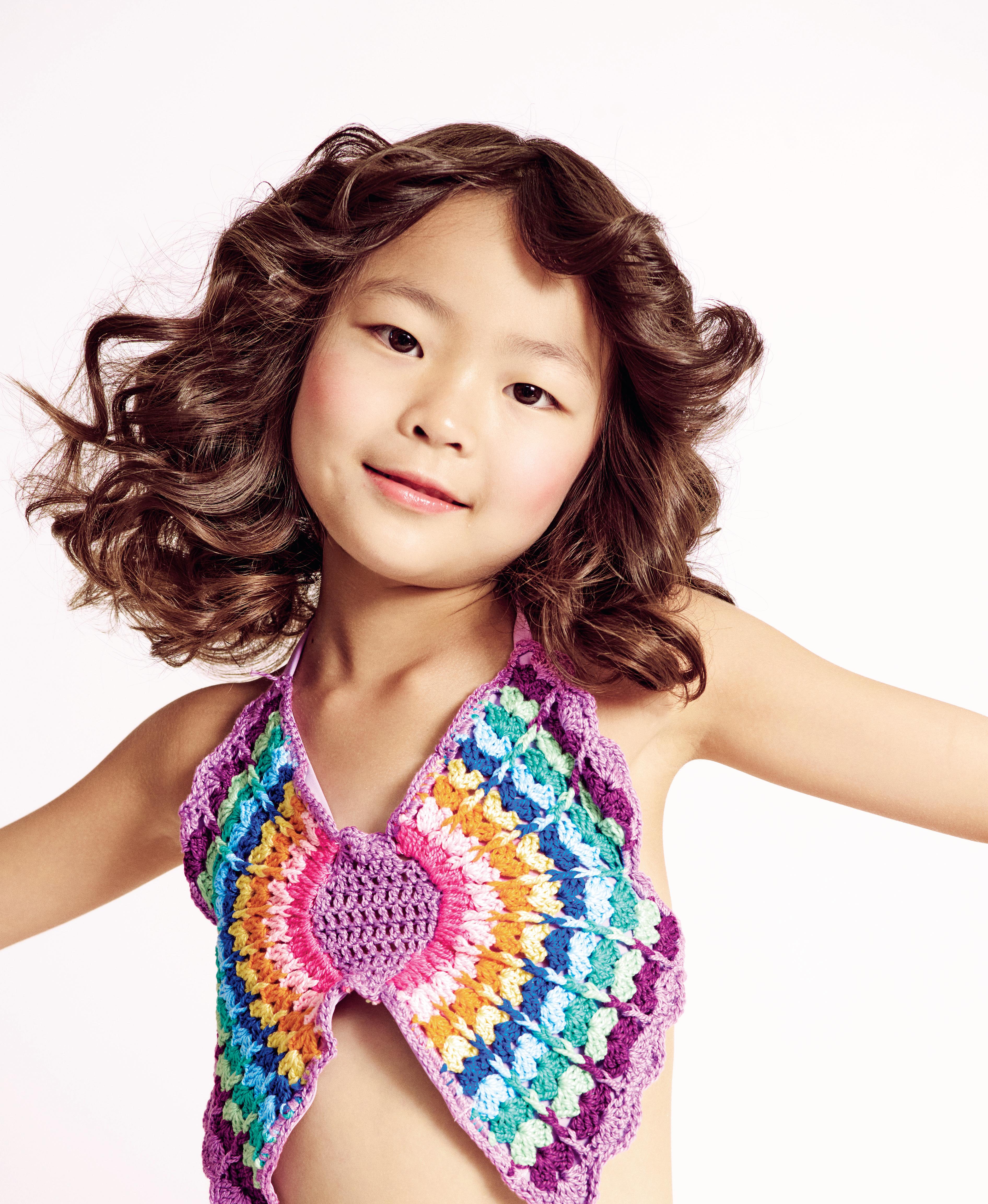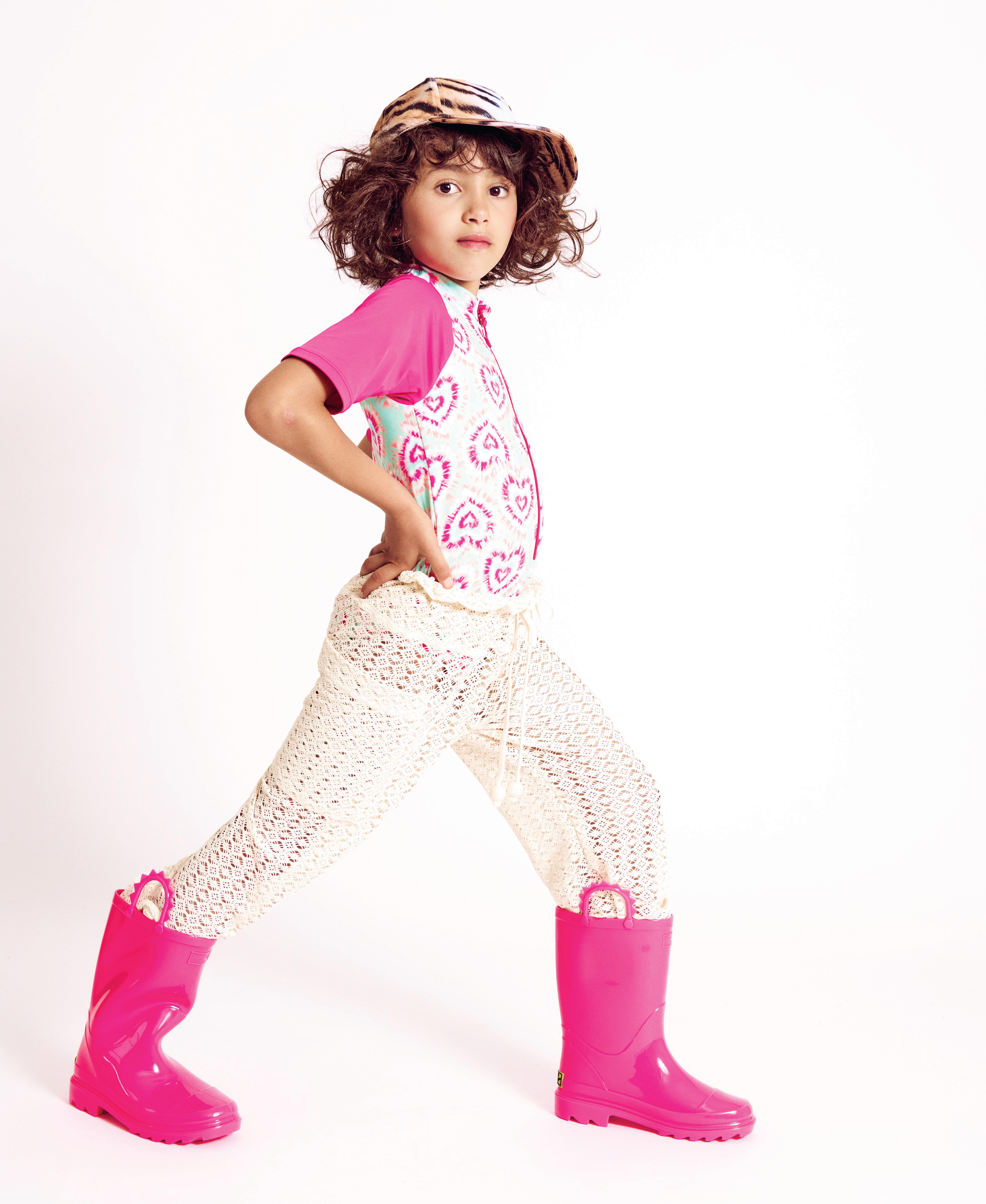 Martina styles a Hatley one-piece with Planet Sea pants, Western Chief boots, and Molo cap. Opposite: Yuna wears a butterfly top by Planet Sea