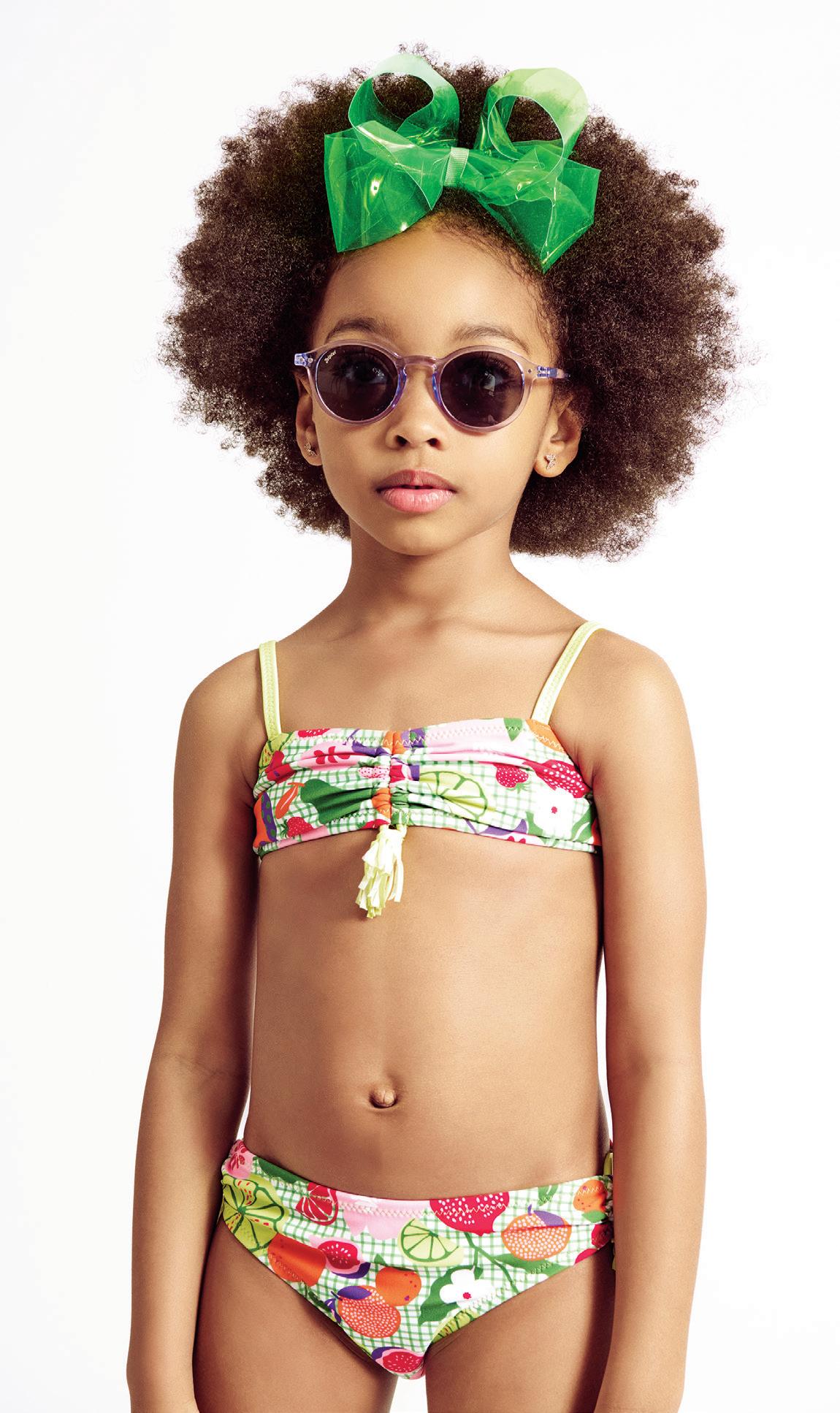 This page: Divine wears a Boboli two-piece, Wee Ones hair bow, and Izipizi glasses. On the cover: Aubriana rocks a Molo swimsuit and Moio beaded bracelets.