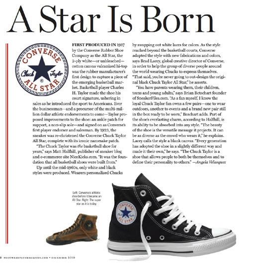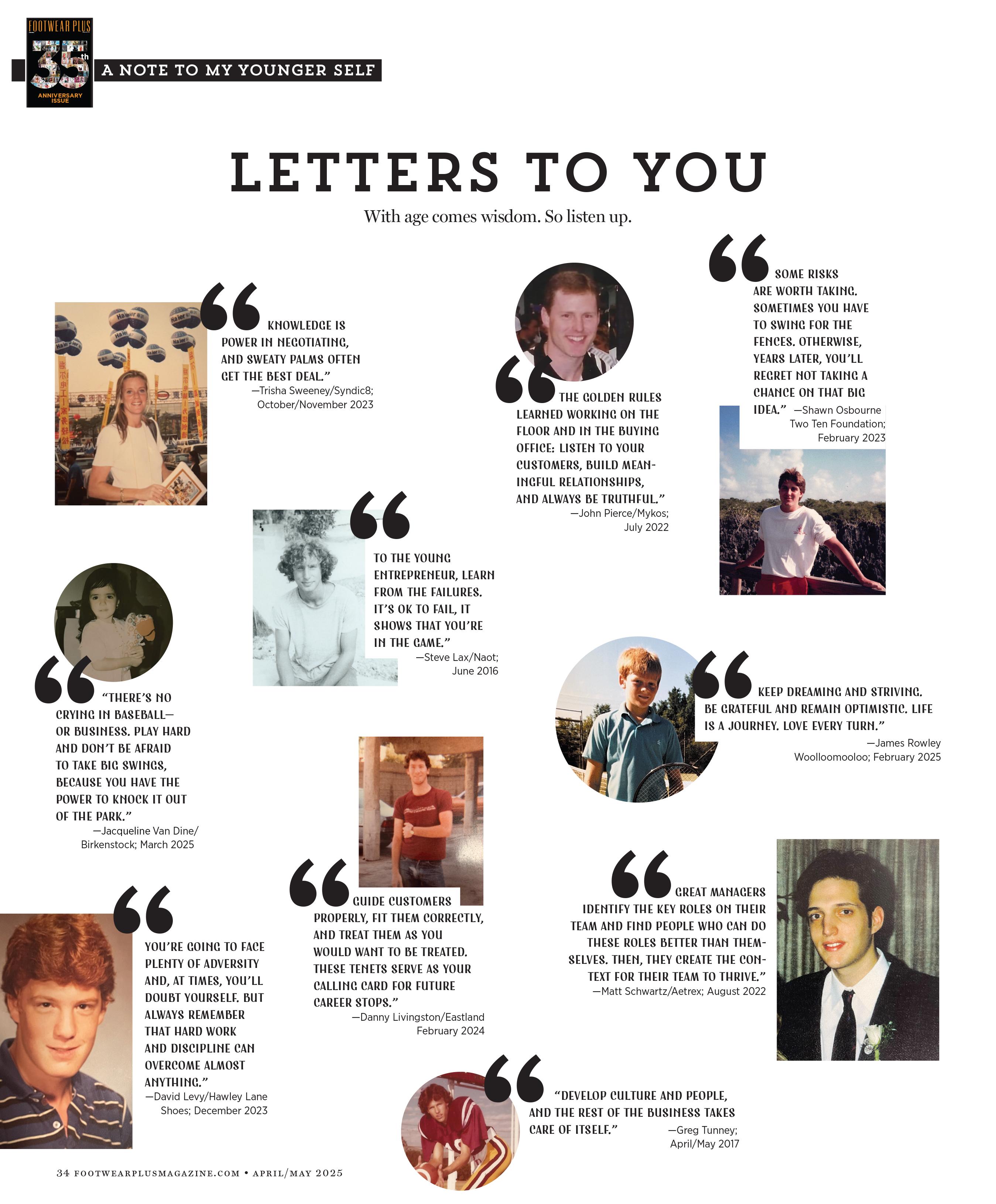 Less than a year into bouncing around several of those titles as part of a trainee program, I was offered a full-time position—only to be told a few months later that there was belt tightening and, as the last man hired, I was about to be fired. That was my indoctrination into the uncontrollable ups and downs of the broader economy. I planned a quick (and tempting) pivot: I’d spend the summer as a badge checker at the beach with a shore house buddy. Alas, there was an opening at Sporting Goods Business, so I passed on a season of sun and sand. At SGB, one of my first beats was athletic footwear. This led to my becoming the features editor at Footwear Plus and then its editor-inchief three years later. The rest is shoe industry coverage history—with much more still to come. In my time here, I’ve produced 300-plus issues, written thousands of articles, and worked for three different parent companies—all while covering one industry.