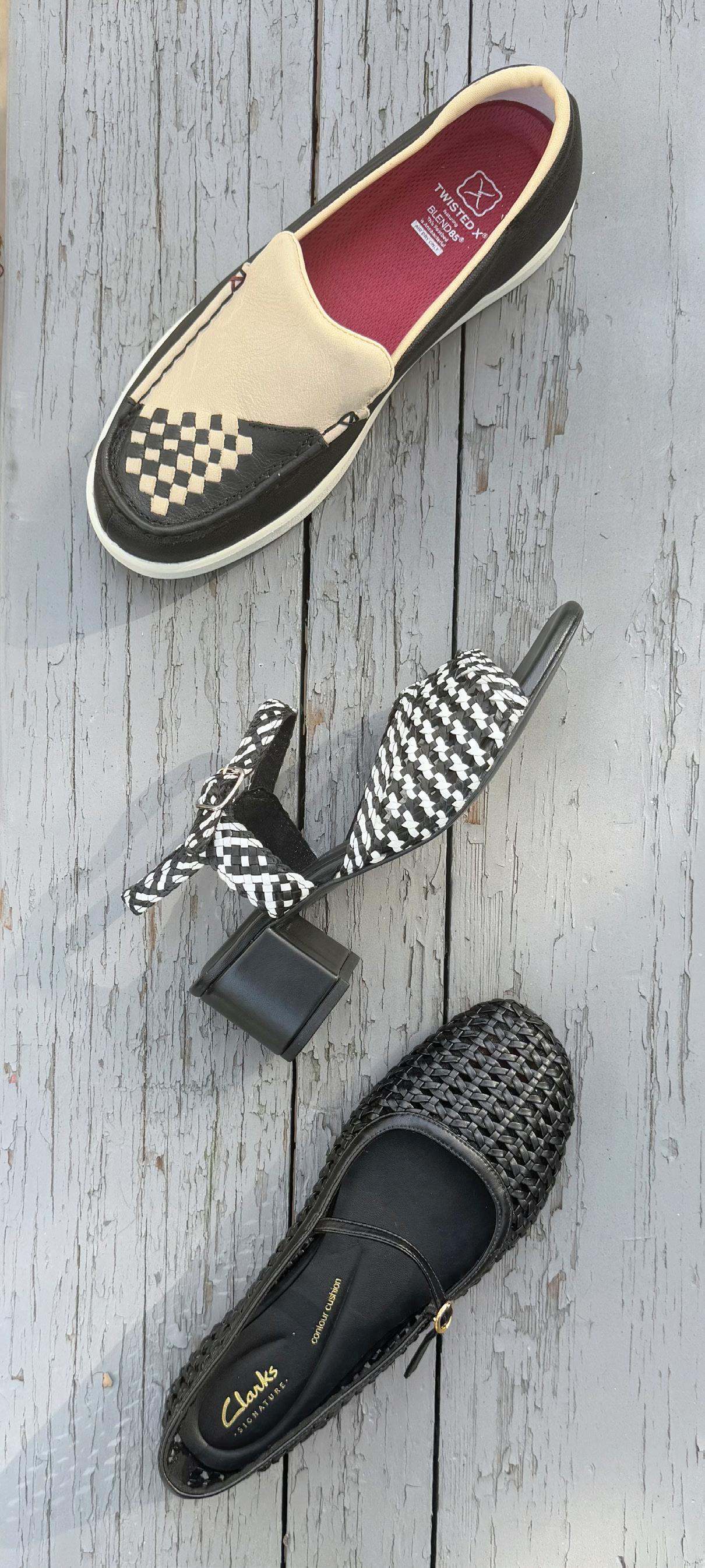From top: Twisted X slip-on moc with woven leather vamp and elastic gore panels; Bos. & Co. woven leather sandal with adjustable ankle strap; woven leather Mary Jane ballet flat by Clarks