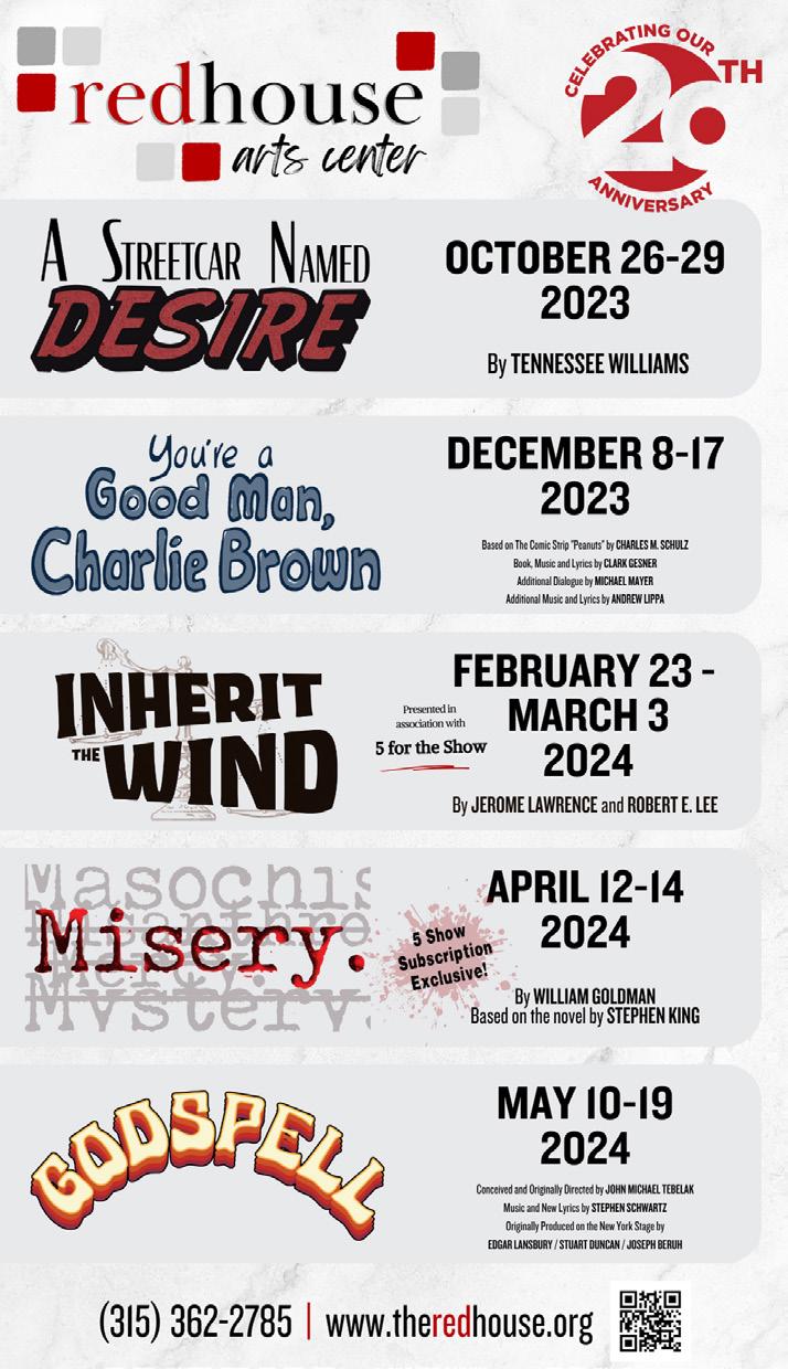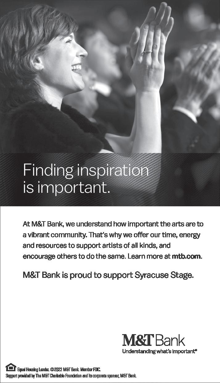 We hope you’ll return to Syracuse Stage for our upcoming 2024-2025 season, as we kick off the next 50 years of incredible storytelling. Subscription ensures the best prices and all the perks – consider joining us today! More information can be found in the lobby, or at www.syracusestage.org.