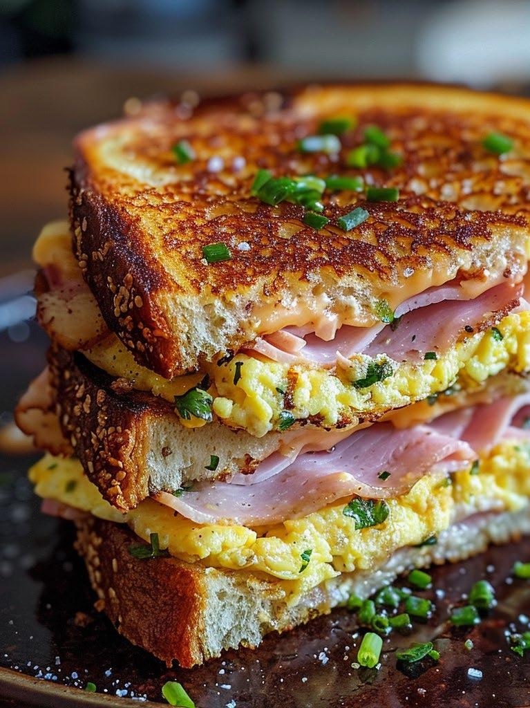 4. Préparer les sandwichs à griller : étaler la sauce à la moutarde et à la mayonnaise sur des tranches de pain, garnir de 1 tranche de fromage, de 1 tranche de jambon et de 1 omelette, d’une autre tranche de fromage et ajouter une tranche de pain.