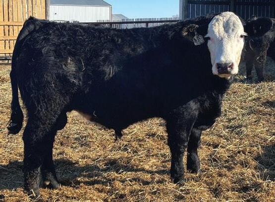 A black baldy calf with a little more punch to him. He will be a perfect choice for smaller cows, along with mature cows. He will throw those calves with chrome or a baldy face.