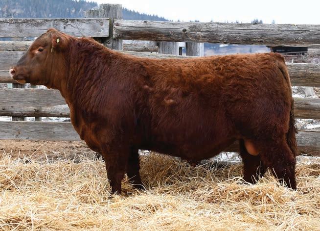 Homozygous Polled, Non-Dilutor. 264M ranks very near the top on my short-list of pen favourites. He takes the cake for being big ribbed, cherry red, attractive fronted and with strong top and hip shape. His dam is still very sound uddered and has always raised good ones. There’s no end to eye appeal here, backed by moderate birthweight, well above average ranking in his WW and YW contemporary groups, and stellar calving ease numbers. He will without a doubt catch your eye come sale day.