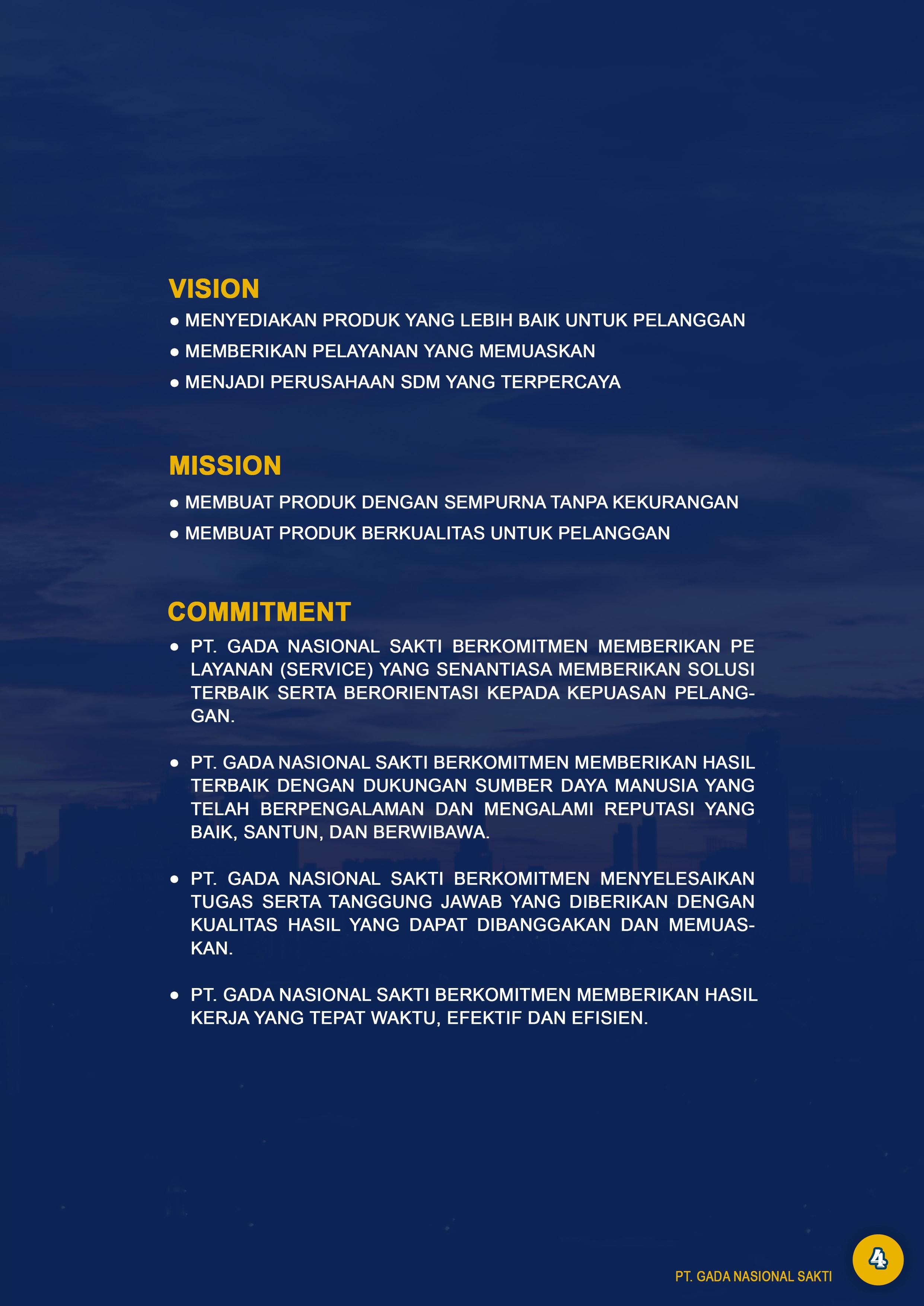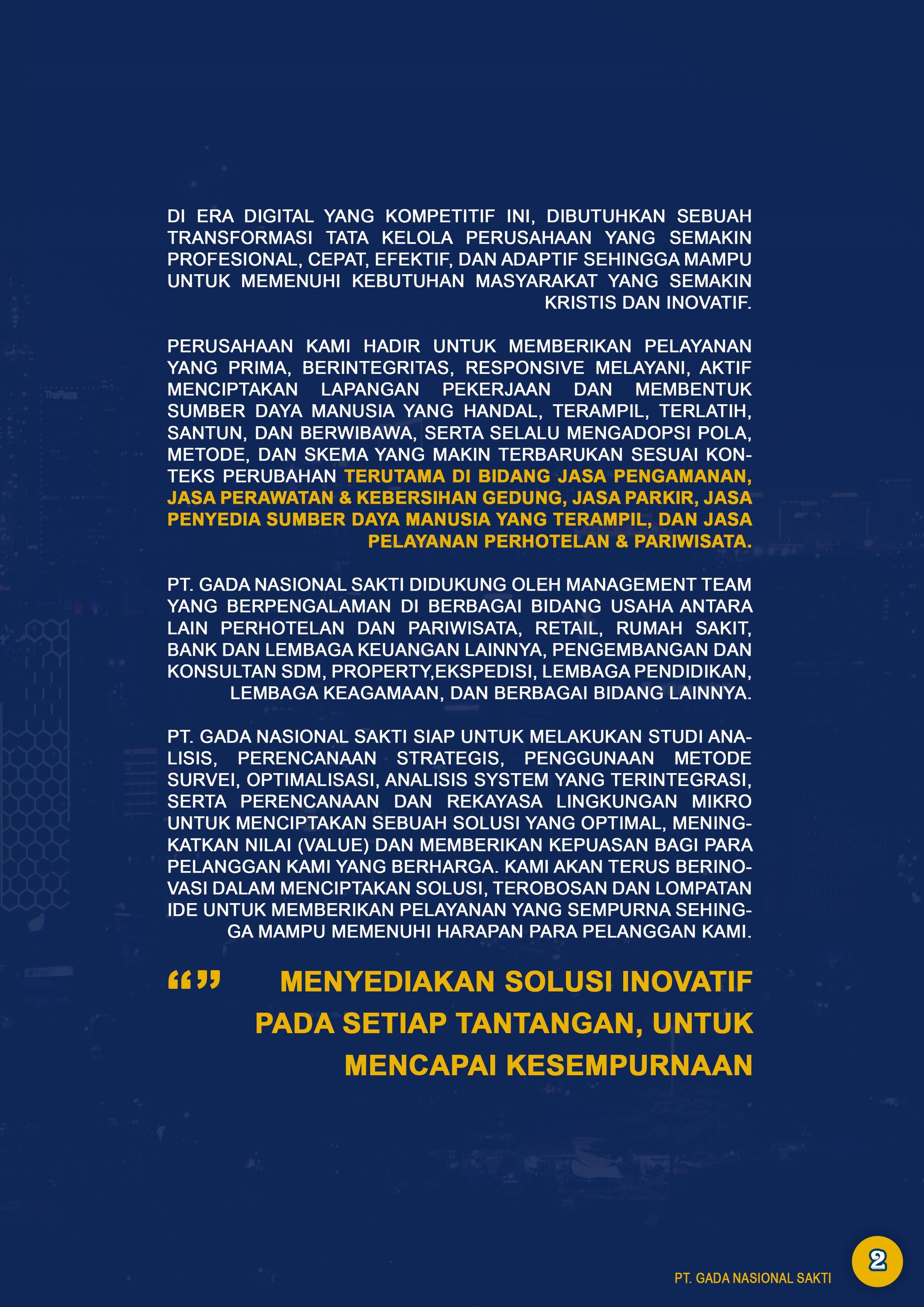 This Freelance Work Is A Promotional book serves as the inaugural company profile for PT. GADA NASIONAL SAKTI, a human resource firm headquartered in Rajeg, Tangerang. Designed to provide a comprehensive overview of the company's offerings and capabilities, it serves as an introduction to their services and ethos.