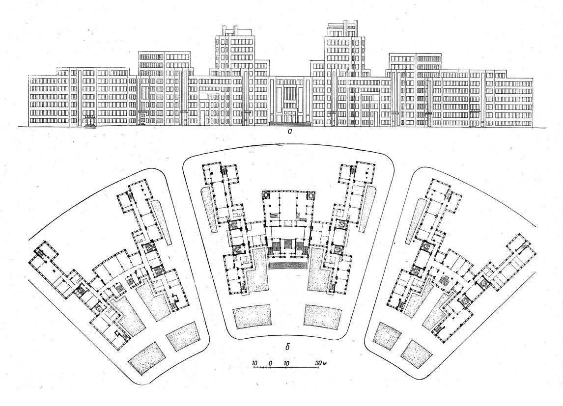 Mihajlovič Limanovskog i Gomberga. Dizajn zgrade se odvijao u nekoliko faza. U prvoj fazi, arhitekti su dobili zadatak da razviju tri verzije buduće zgrade, koje bi se razlikovale po kompozicionim tehnikama, arhitektonskim rješenjima, ali i po visini - od 9 do 40 spratova. U sljedećoj fazi radilo se na dvije odabrane varijante: zgrada od 16 spratova (sa naglašenim prednjim dijelom fasade i tri nivoa u smanjenju visine) i zgrada od 20 spratova (sa jasno izraženom težnjom prema gore, bez vertikalne podjele). Njihovi nacrti su predstavljeni vladi. Obje opcije su dobile dobre ocjene, međutim za daljnji razvoj odobrena je druga, koja je kasnije dobila Staljinovu nagradu za arhitekturu.Prvenstveno je montiran ramovski okvir zgrade u punoj dužini, a sama gradnja se odvijala od vrha do dna.