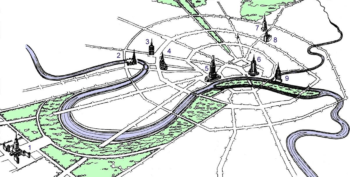 1 — Moscow State University 2 — Hotel Ukraina 3 — Kudrinskaya Square Building 4 — Ministry of Foreign Affairs 5 — Palace of the Soviets (nikad izgrađeno) 6 — Zaryadye Administrative Building (nikad izgrađeno) 7 — Leningradskaya Hotel 8 — Red Gates Administrative Building 9 — Kotelnicheskaya Embankment Building