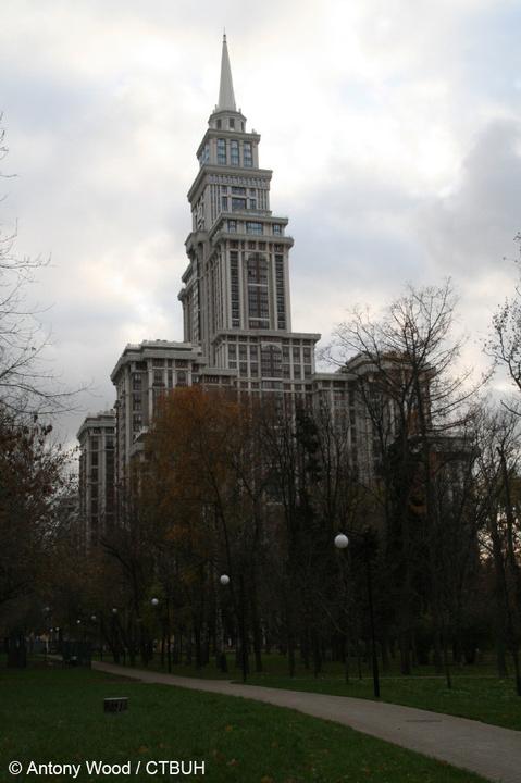 Trijumf palata , Moskva , Rusija Iako je izgradnja stambene zgrade ,,Triumph palace” , završena 2006. Godine, njen izgled podsjeća na Staljinove nebodere iz perioda 1947-1953. Godine pa nerijetko ovaj objekat nazivaju i ,,osma sestra''. Po nekim navodima, arhitekti Trijumf palate su tokom samog njenog projektovanja koristili arhivskim skicama i nacrtima nebodera u kompleksu ,,Sedam sestara” i prilagođavali dimenzije buduće zgrade u skladu sa lokacijom. Trijumf palata se sastoji od 9 cjelina različite visine, smještenih na zajedničkom 5-spratnom stilobatu. Fasada Trijumf palate je napravljena od panela svetlih boja, dajući joj čist i ujednačen izgled. Zgradu upotpunjuju dekorativni elementi, uključujući pilastre, vijence i druge neoklasične elemente.Dominantna karakteristika je središnji dio od 57 spratova visine 264,1 metar, uzimajući u obzir 48-metarski toranj složenog dizajna. Ubrzo, nakon izgradnje Trijumf palate uslijedile su brojne kritike od strane arhitektonske zajednice. Oni su kritikovali nedostatak umjetničkih elemenata u poređenju sa Staljinovim neboderima kao i lošu orjentaciju zgrade u odnosu na ulicu jer je takvom orjentacijom zgrada izgubila na volumenu.