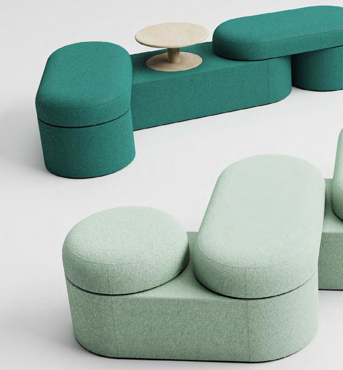 Produced from upcycled foam offcuts, BuzziReForm repurposes manufacturing waste into acoustic seating solutions with minimal environmental impact.