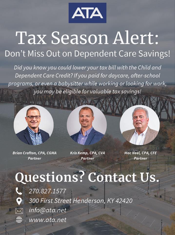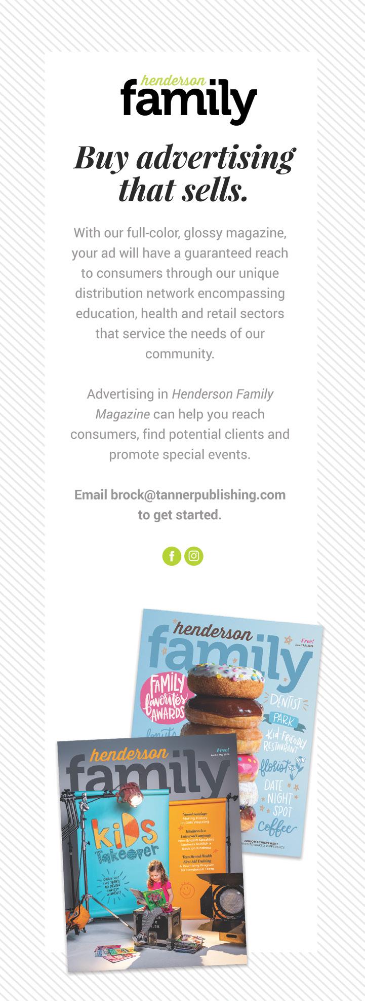 Henderson Family is a FREE magazine because of community support. Thank you to the great group of businesses and organizations who advertise. For more information about advertising call 270-297-1600 or email brock@tannerpublishing.com.