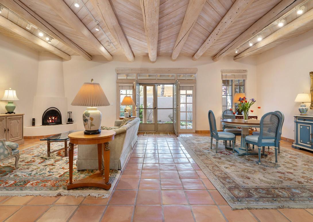 Classic Taos style with saltillo tile floors, fireplace, beams and tongue & groove ceiling. Good floor plan, with kitchen open to dining & living areas, bedrooms on opposite sides.