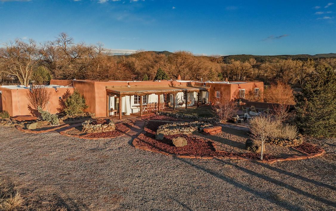 This 3 bedroom 4 bath, 3300 sq ft adobe sits on the storied Talpa ridge together with a detached adobe 1125 sq ft, 1 bedroom, 1½ bath guesthouse. With surface water rights, a small irrigated pasture, views to the NE to Taos Mountain, to the south of Picuris Mountain and to the west of El Pedernal and the Jemez range.
