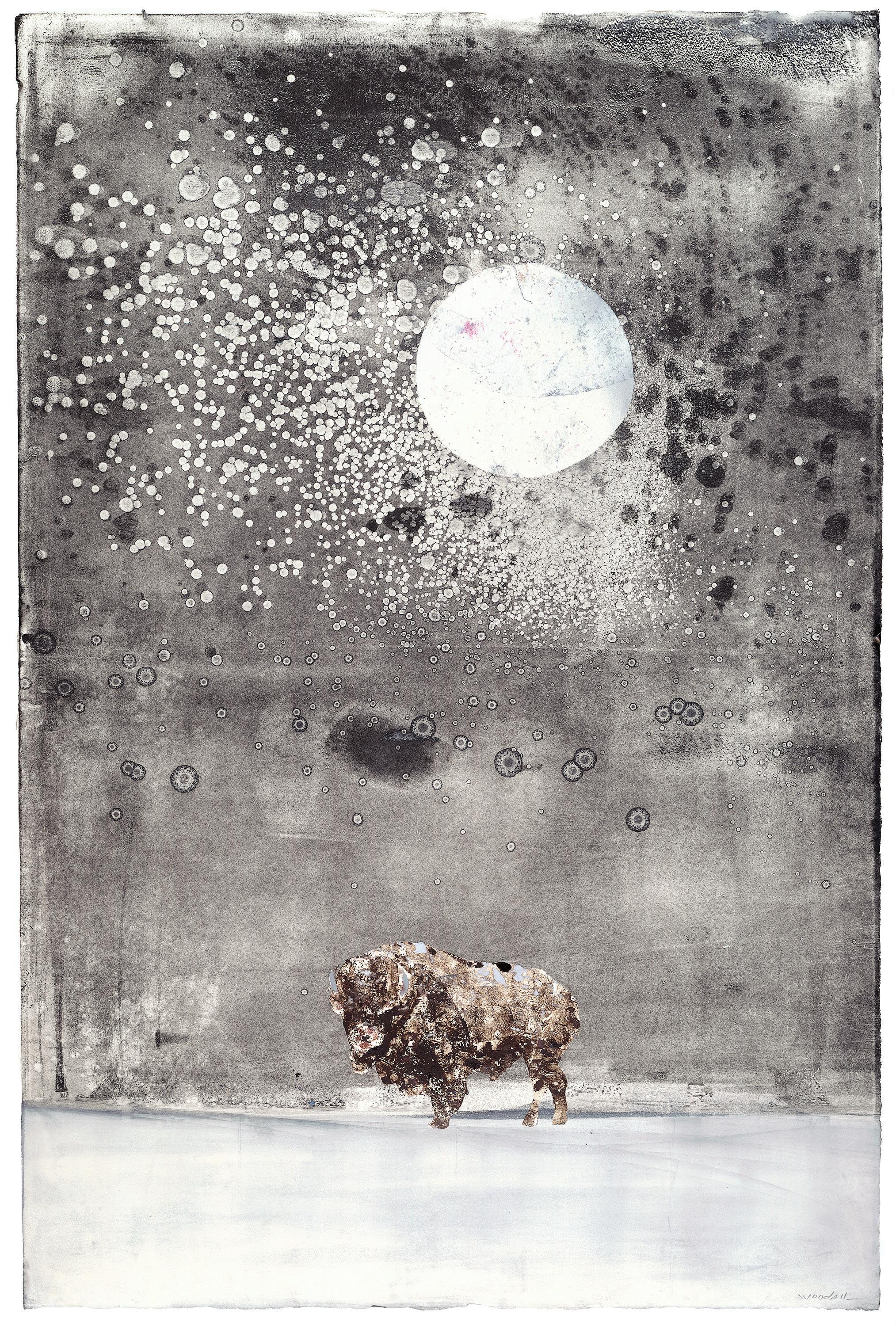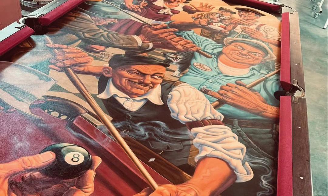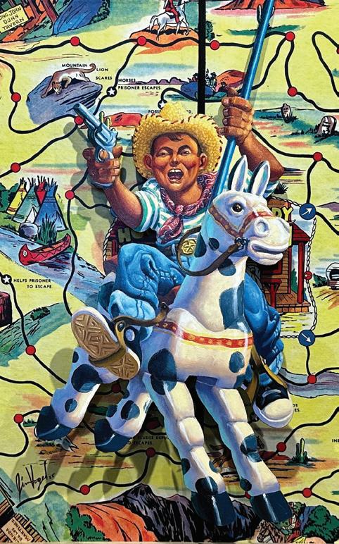 ABOVE: Jim and Christen Vogel, In Pursuit of Bandits, El Caballito BreaksFreefromFlyingJinny (detail), 2025, oil on panel with vintage boardgame and carrum board, 28.25 x 28.25 in