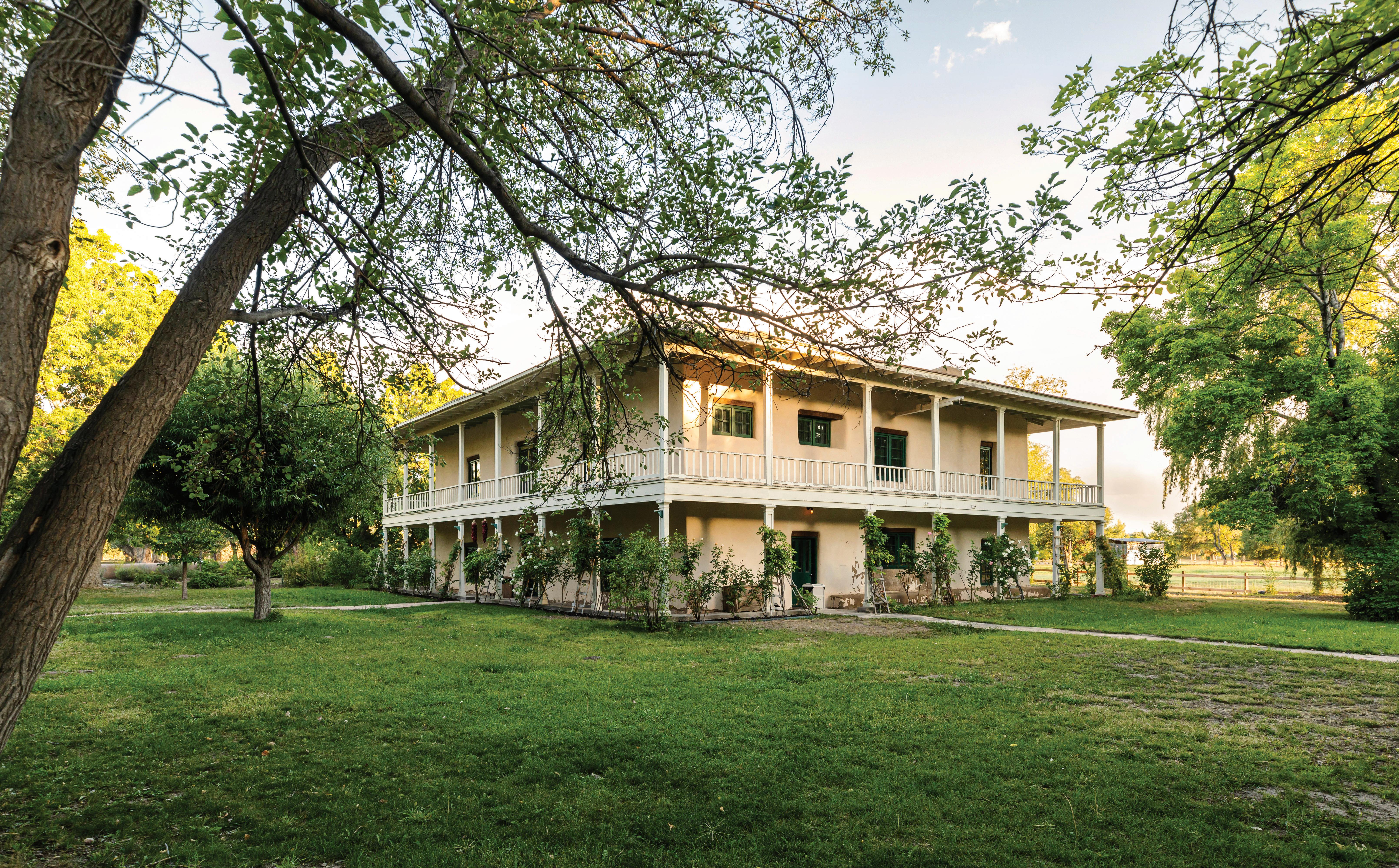 Built in 1887, the original structure was a modest tworoom adobe built by Frank Bond after his arrival from Quebec, Canada. He and his brother, George, had moved to Española during its early railroad boom to establish GW Bond & Bro., a mercantile venture that would grow into the largest wool and mercantile empire in New Mexico. Frank Bond was also an instrumental leader, serving as Española’s first ex officio mayor. By 1911, Bond expanded the home with a two-story territorial-style addition, blending adobe with Victorian elegance — red-tile gabled roof, dormer windows, brass fixtures and a columned front porch.