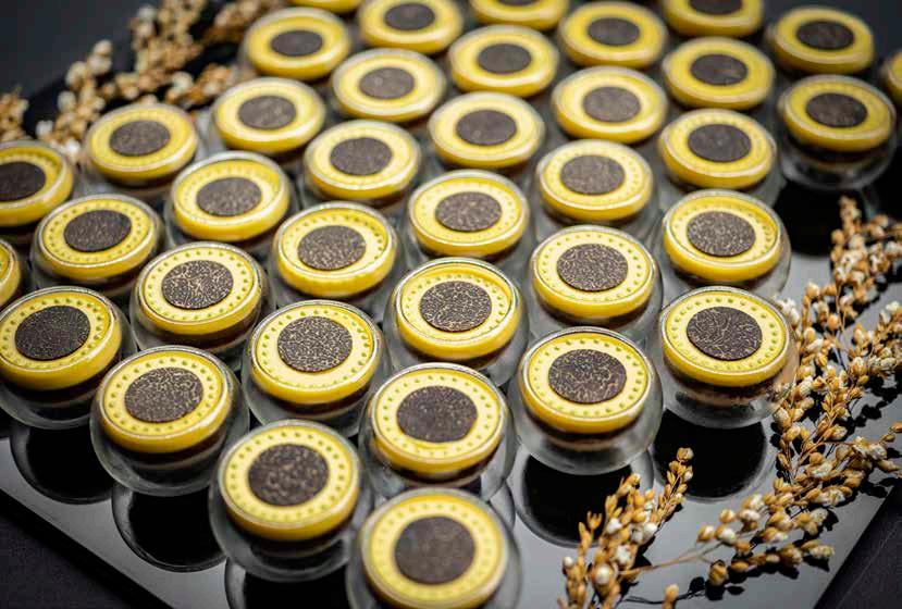 between Wong and Duo Yun Xuan Art Center inspired by the television series Blossoms Shanghai. There they find exquisite Italian pastries housed in cherrywood and brass cabinetry reminiscent of Prada’s earliest boutiques. Crosara looked to the aesthetic universe of Wong when crafting his offerings. Regional desserts like tiramisu, cassata, and pasticciotto are reimagined in form while staying true to their origins. “There must be harmony between what is seen and what is tasted,” he notes.
