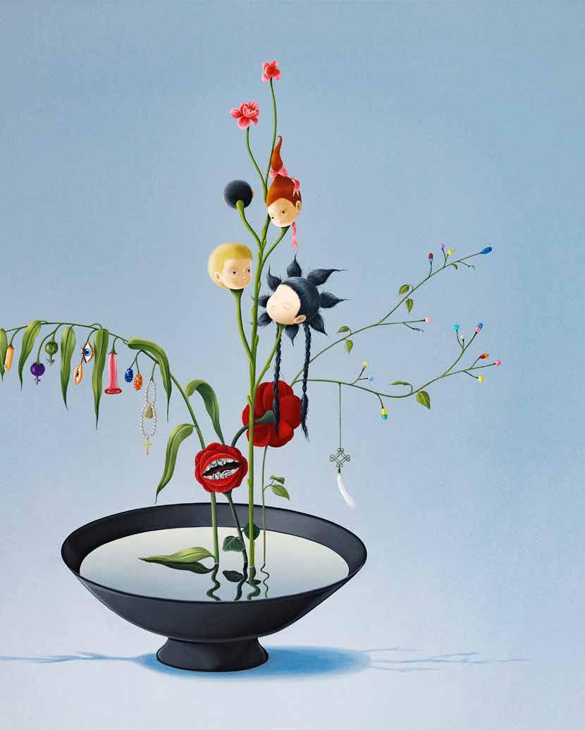 Laying out a spread for deeper musings on identity, memory, and societal values are Fusion Cuisine, a large artwork showing two disembodied heads peering out from tableware beside a flower-filled vase on a Chinesestyle table, and the installation by the same name, where dishes of fast fashion, magazines, and CDs revolve on a lazy Susan. “In any culture,” explains Frogier, “food is a fundamental social act that contains multiple and contradictory values related to cultural identity, family bonds or conflicts, national affiliation, or cross-cultural links. In this exhibition, food deals with such cultural frictions but also goes beyond them, embracing larger topics, such as pollution, environmental care, overconsumption, artificiality, and destruction of human and nonhuman components.”