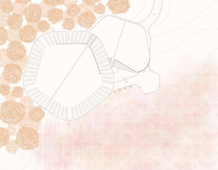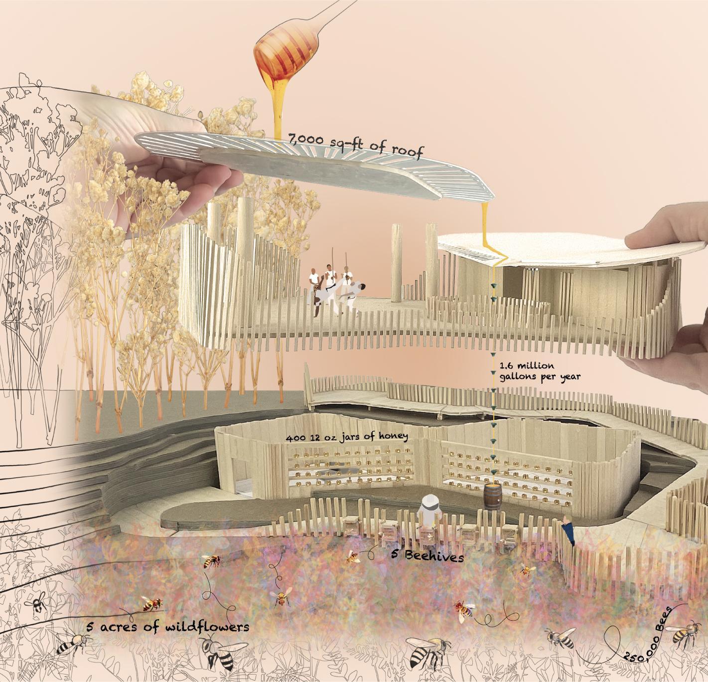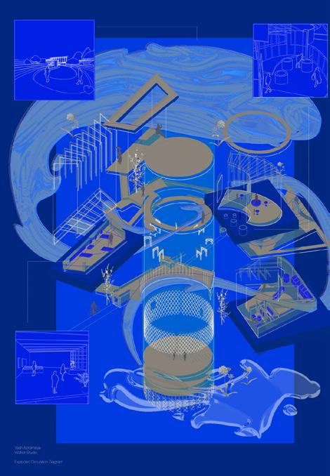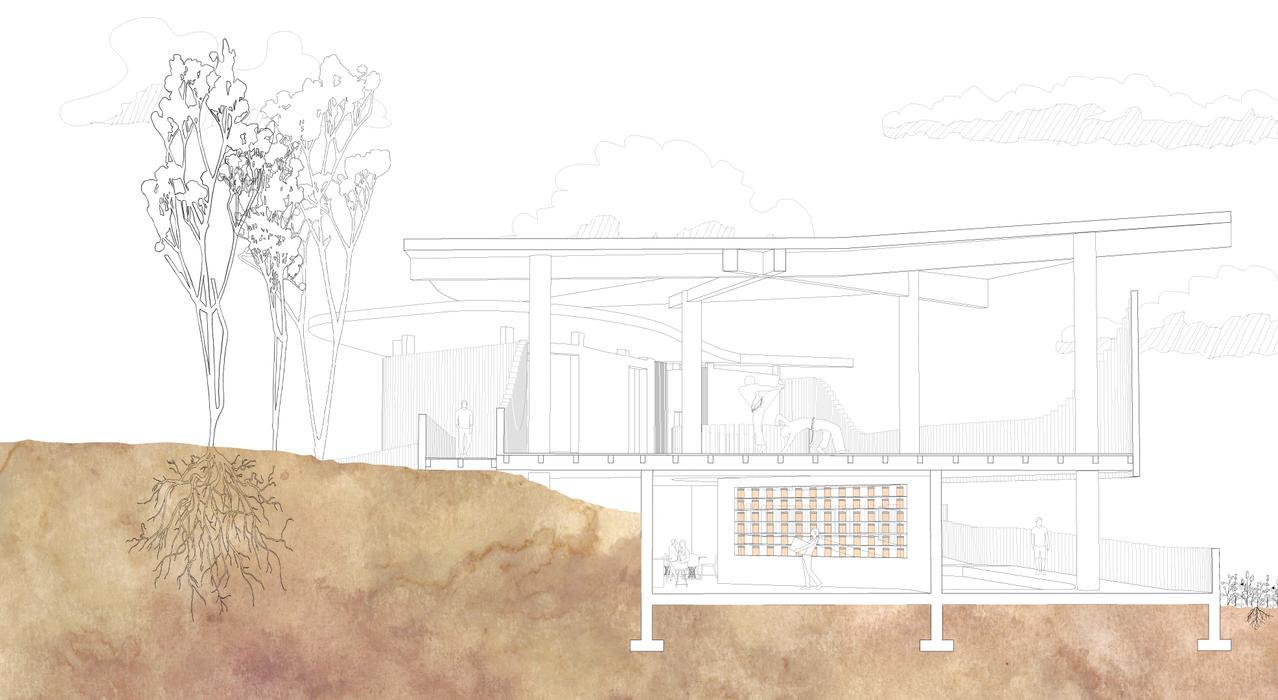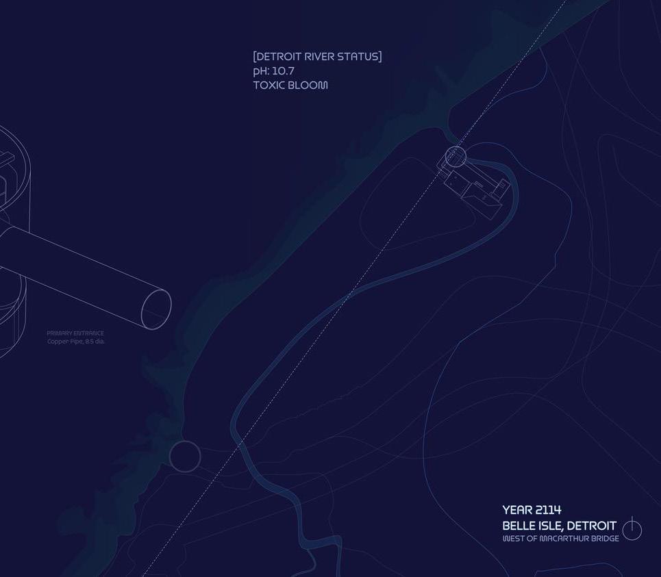 Killing off fish and vegetation, the Huron River’s polluted waters actively prevent a thriving local ecosystem. Drawing inspiration from the resilient nature of Capoeira, the active motion of the “Jinga”, and the sport’s natural reliance on community, nature, and storytelling, a proposed fieldhouse envisions the ionization of algae-infested tides. By harnessing the power of constant motion of the dance— a constant fight and an ongoing history, Pavogen tiles allow for Capoeristas to convert their kinetic energy into a physical purification system filtering Huron River water into a pond, allowing for irrigation, offering safe drinking water, and a builtaround community center.
