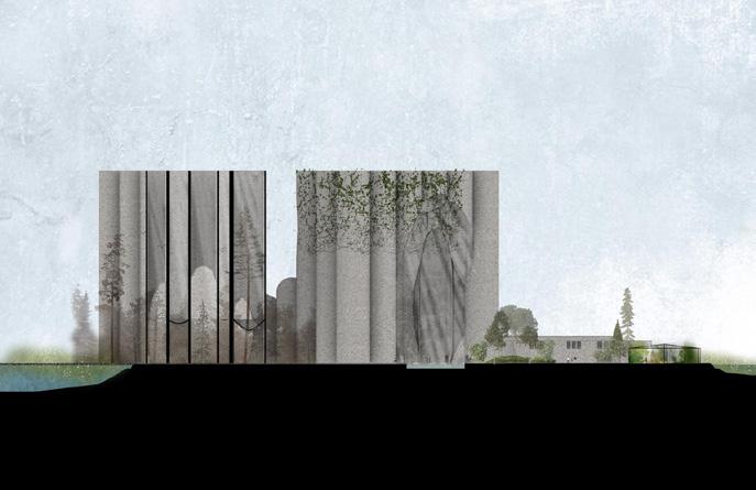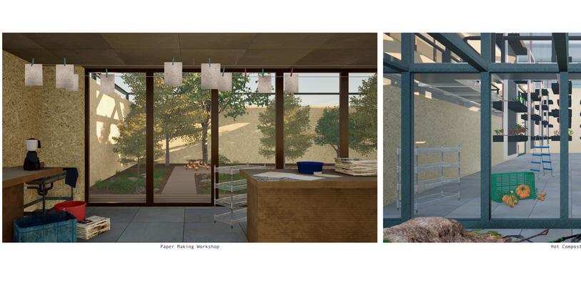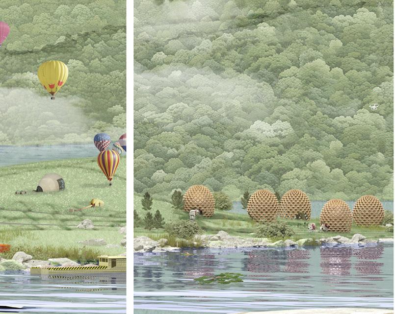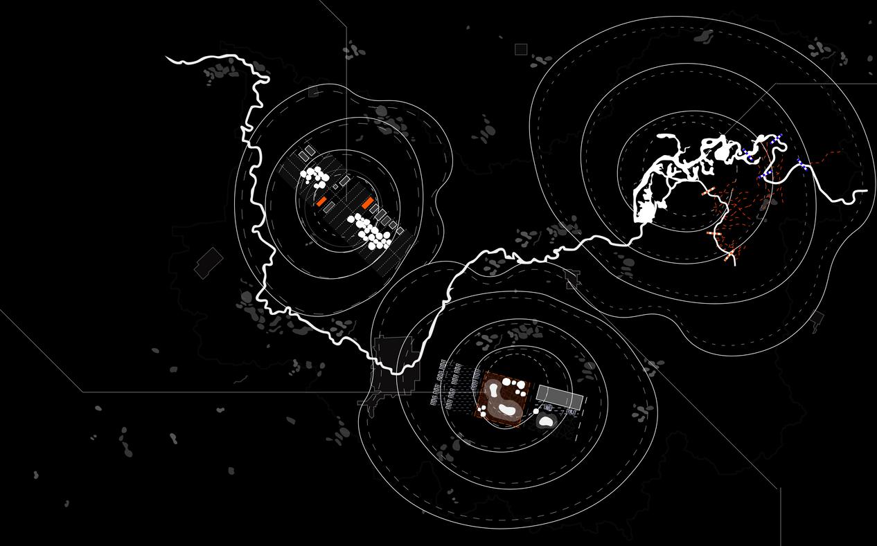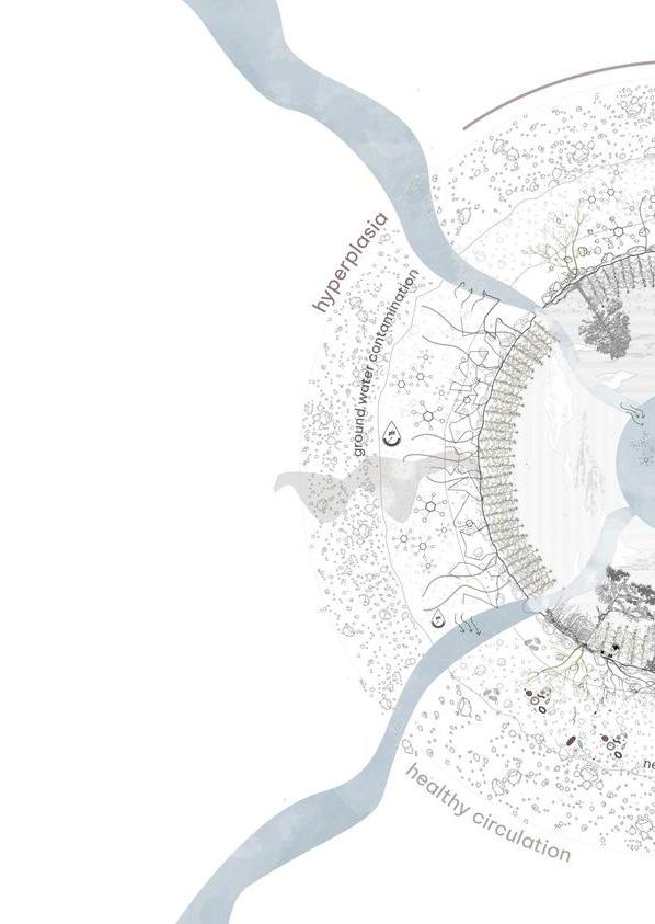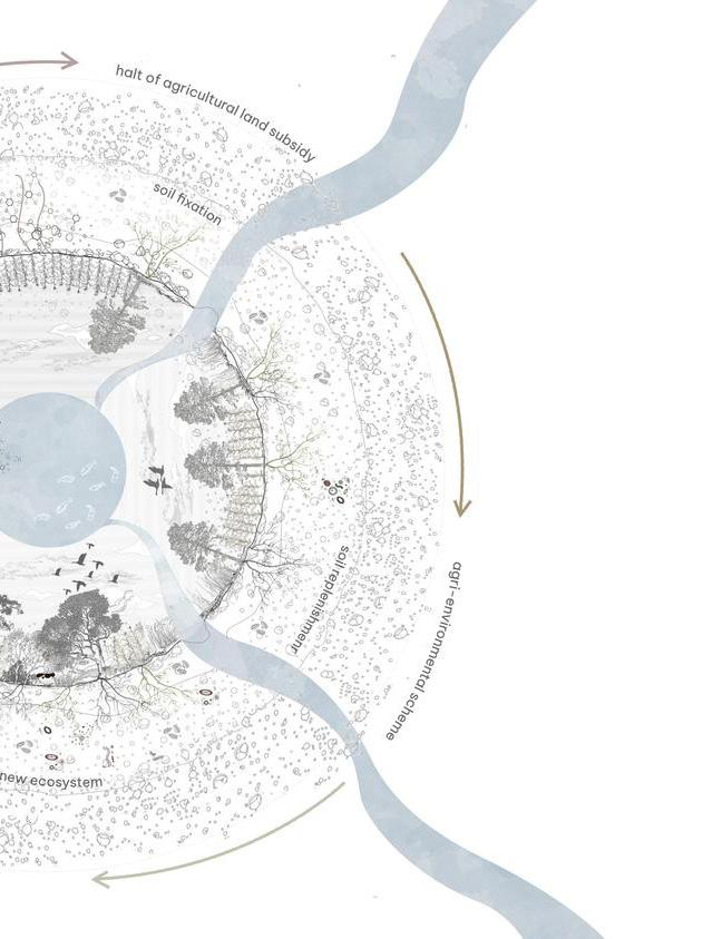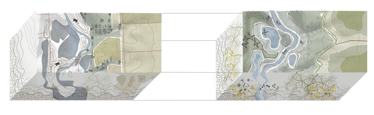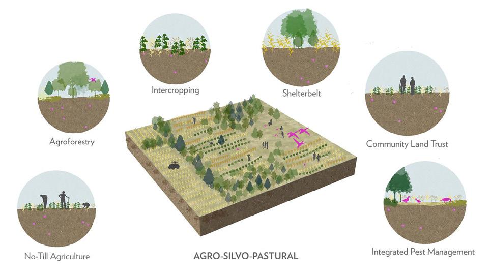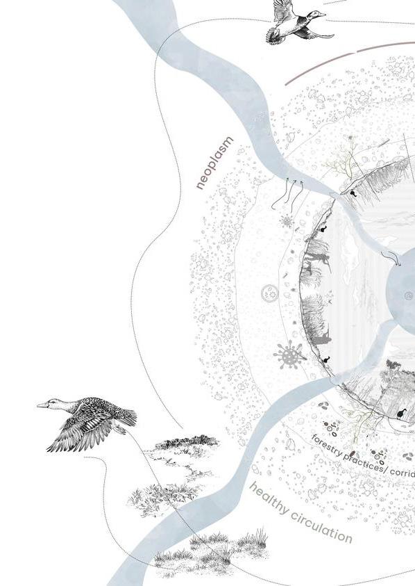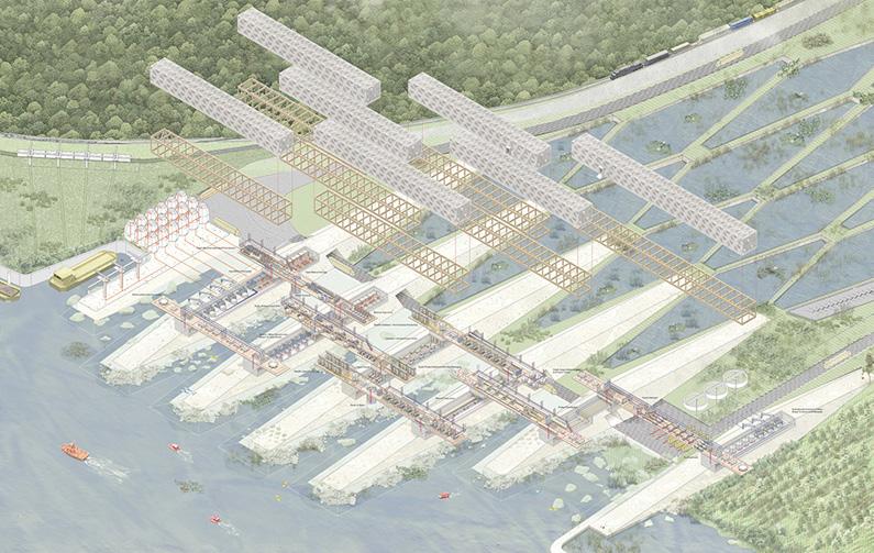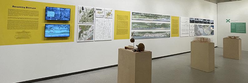 Becoming Biomass is a speculative design research project that envisions a future cooperativemanaged agroforestry and biomanufacturing transformation in the Tennessee Valley region toward decarbonization and regenerative coexistence. The project deploys methods of narrative and scenario-based world building to depict a multiscalar and multi-system future for the region and its human and nonhuman constituents. It is situated in the context of justiceoriented decarbonization that involves dismantling carbonbased material economies through new organizations, collaborations, infrastructures, landscapes, and architectures. The speculative proposition is informed by research in biomaterial science, sustainable agroforestry, biogenic architectures, and a new vision for industrial architecture. Critical drawings such as actor networks, thick cartographies, notational scores, deep sections, and scroll drawings accompany narrative videos and analytical physical models. The project was commissioned by the University of Tennessee and exhibited at the Regional Globalism in the Tennessee Valley exhibition the Ewing Gallery in November 2024. A book publication is forthcoming.