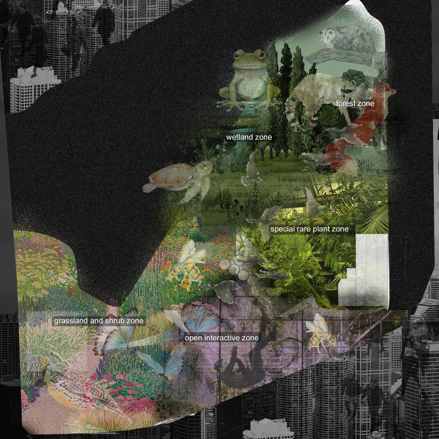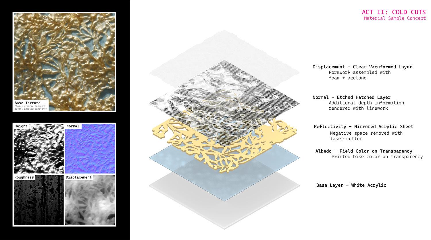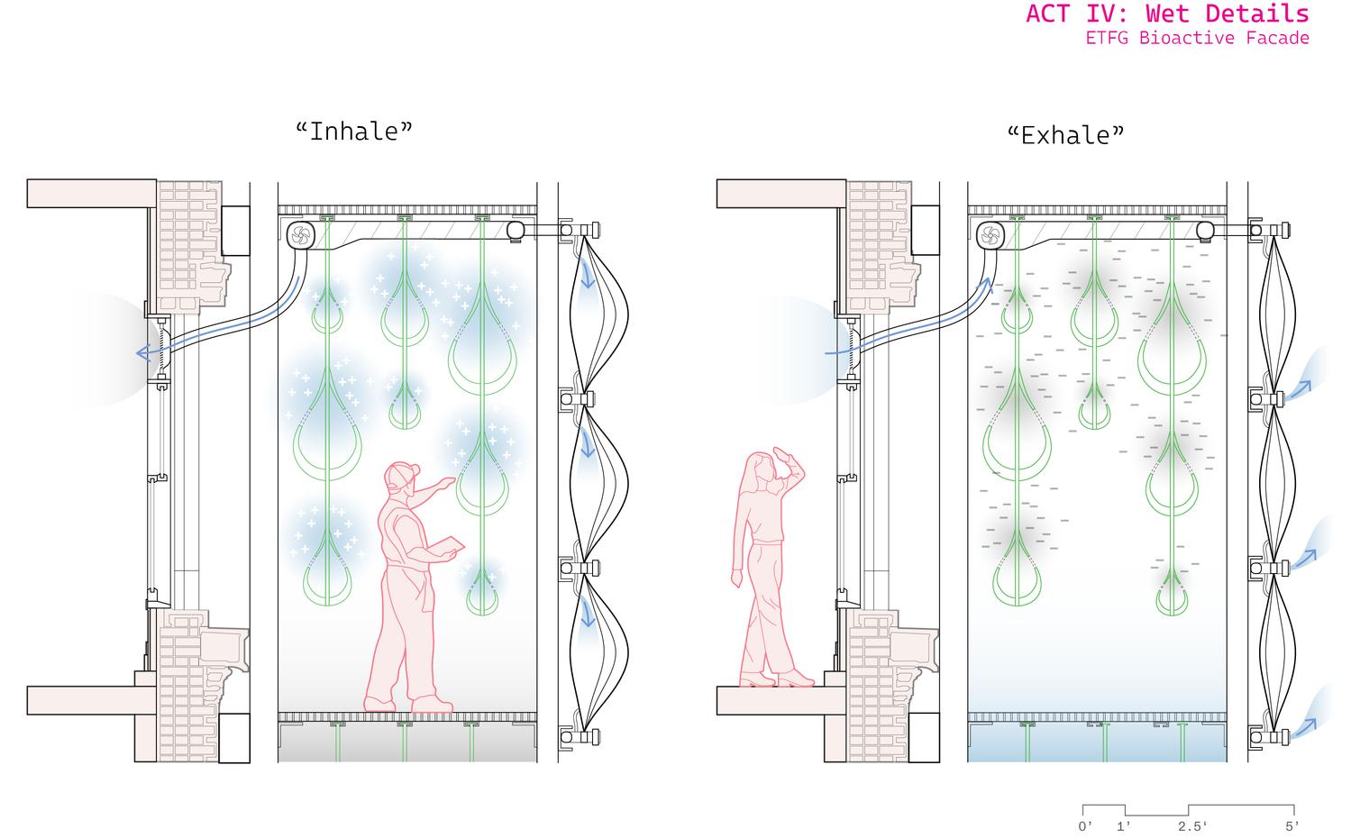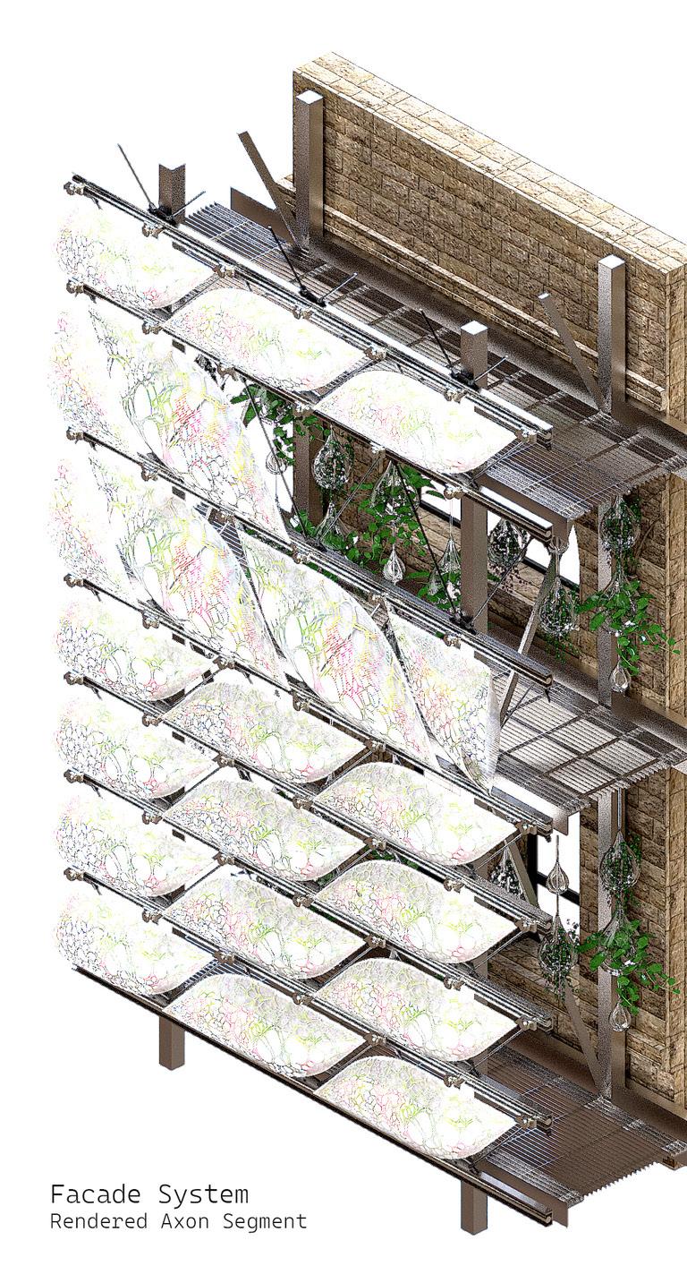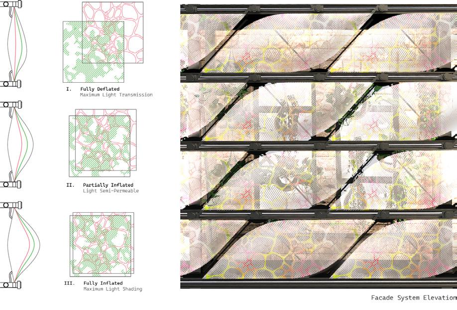 Through a series of investigative ACTS, “Cellular Dynamism” explores bio-based motifs and processes in dialogue with contemporary layered construction assemblies. [II] Extracts a physical layered sample from generative digital textures. [III] Uses the metabolic processes of plants as a backdrop to stage mediated experiences between light, water, and digital systems through a catalogue of bio-active figures within an interactive diorama. [IV] Builds upon the accumulated research to propose a biophilic alternative to the double-envelope typology, utilizing an interior green zone coupled with an exterior responsive-patterned ETFG cushioning system to condition the interior environment and experientially communicate environmental conditions to occupants.